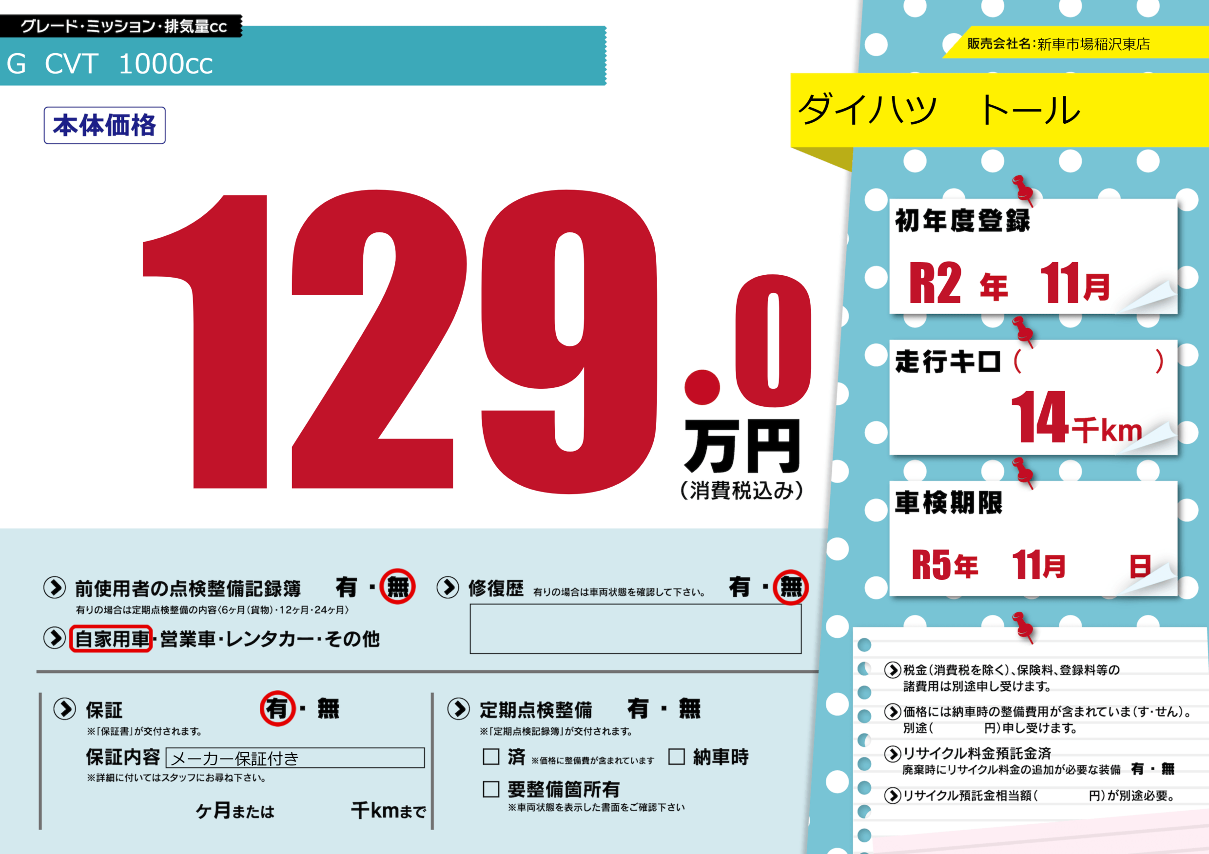 | 車検制限 | R5年 11月 - 日 | ||