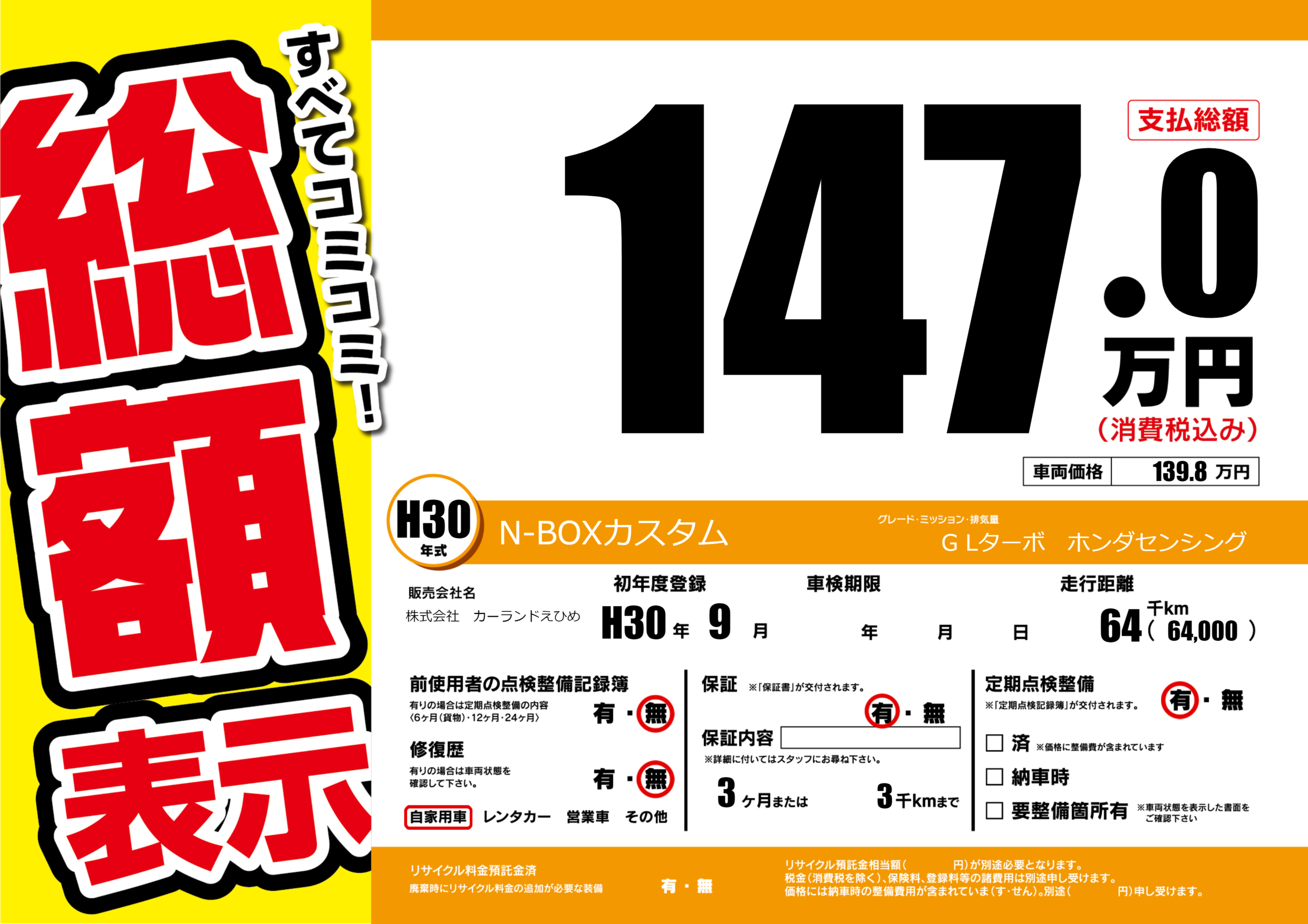 | 走行キロ | 6.4万km | 初年度登録 | H30年9月 |