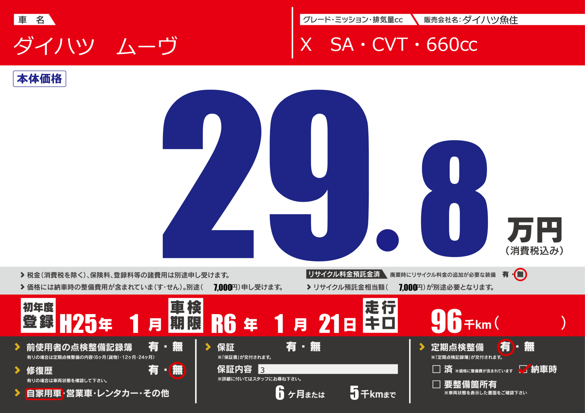| 定期点検整備 | 定期点検整備あり 納車時あり | ||