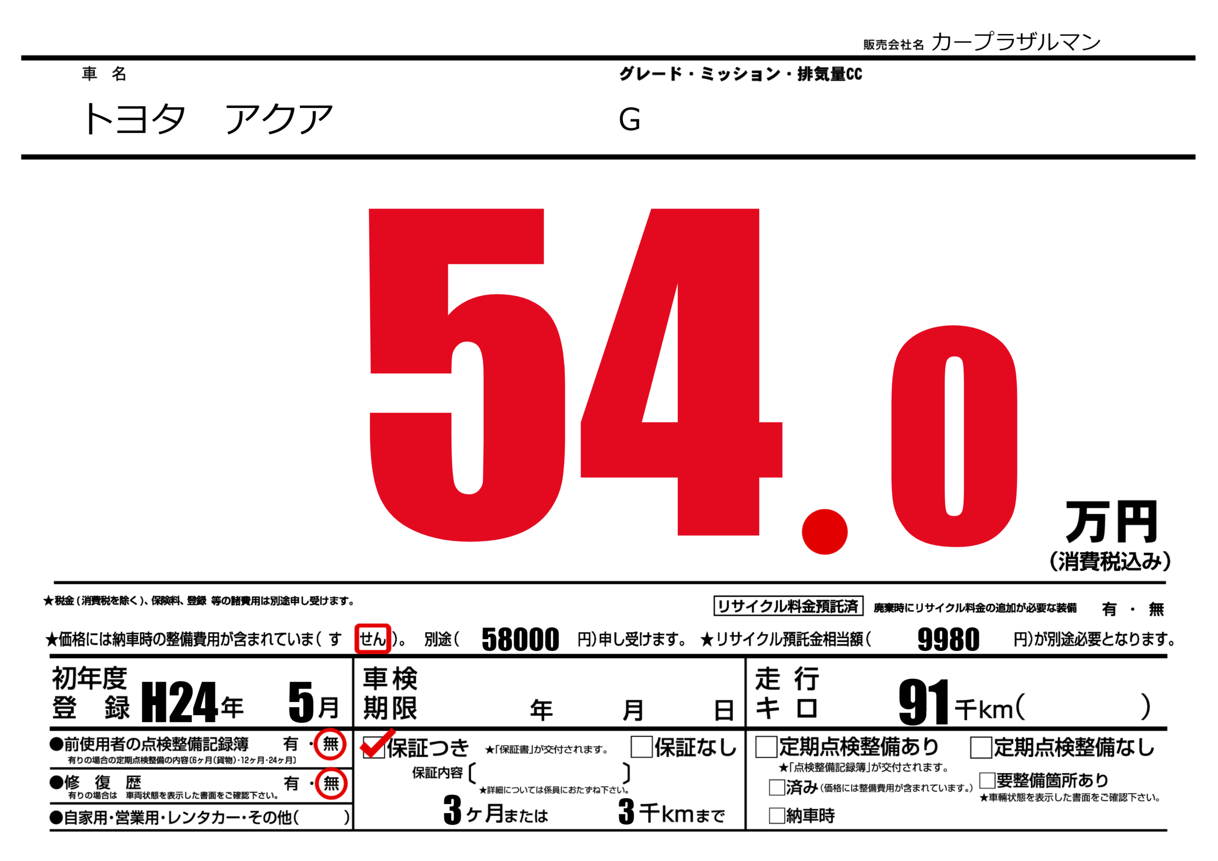 | 車名 | トヨタ アクア | グレード ミッション 排気量 |