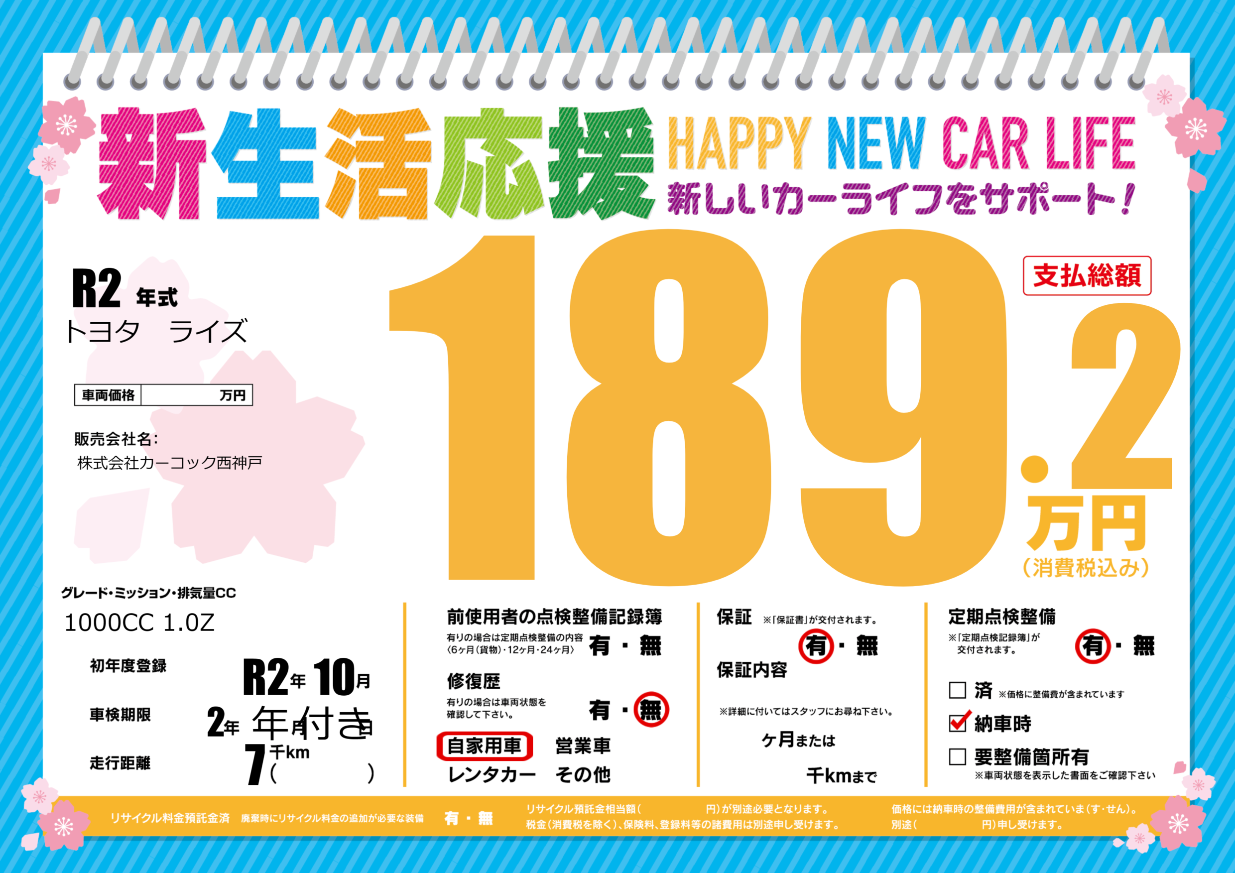 | 車名 | トヨタ ライズ | グレード ミッション 排気量 |