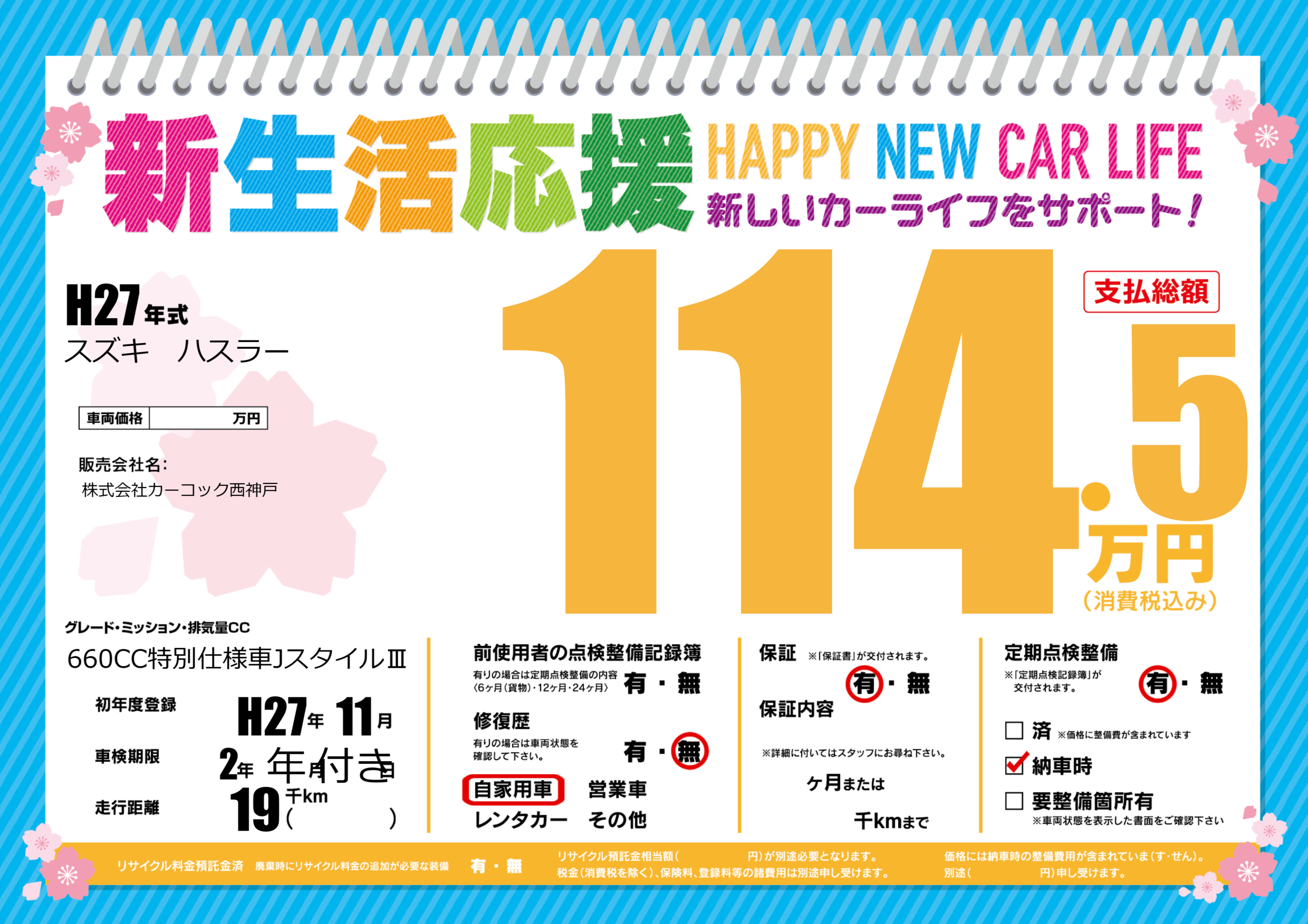 | 定期点検整備 | 定期点検整備あり 納車時あり | ||
