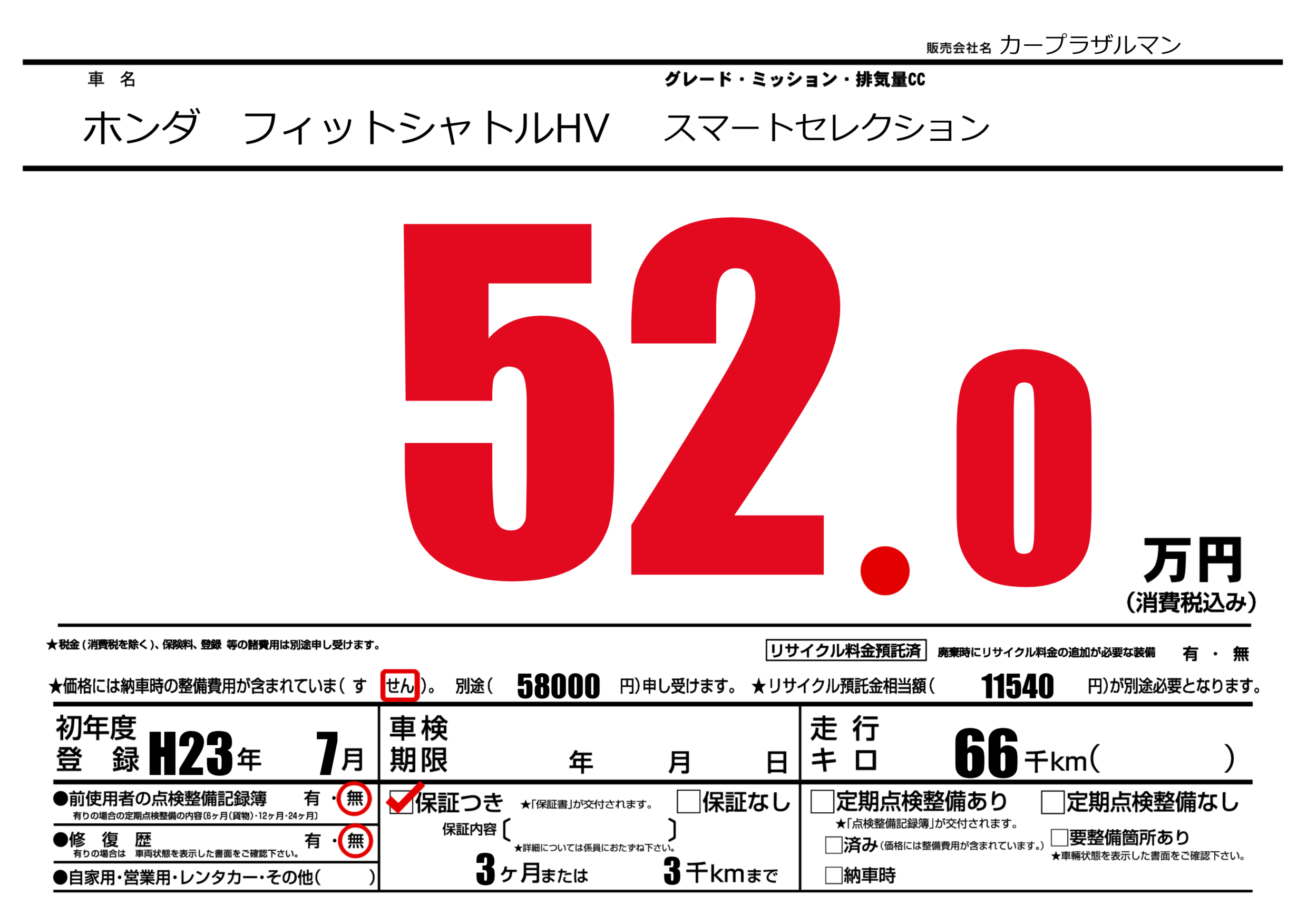 | 車名 | ホンダ フィットシャトルHV | グレード ミッション 排気量 |