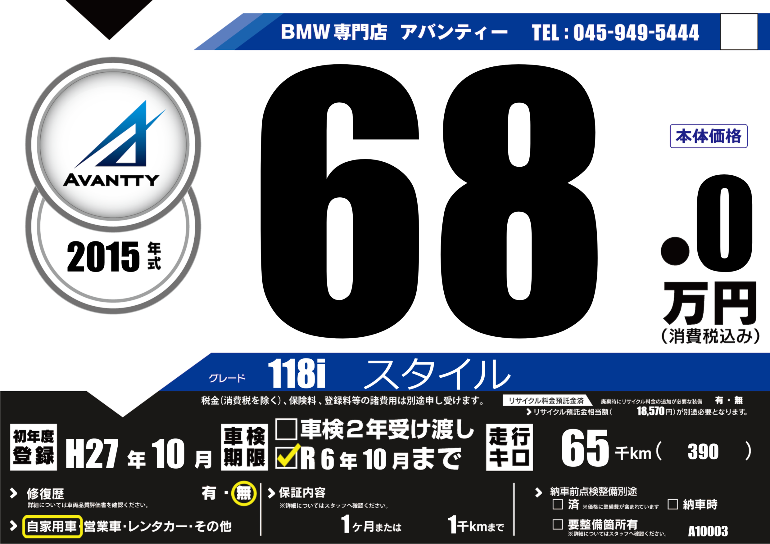 | 走行キロ | 6.5万km | 初年度登録 | H27年10月 |