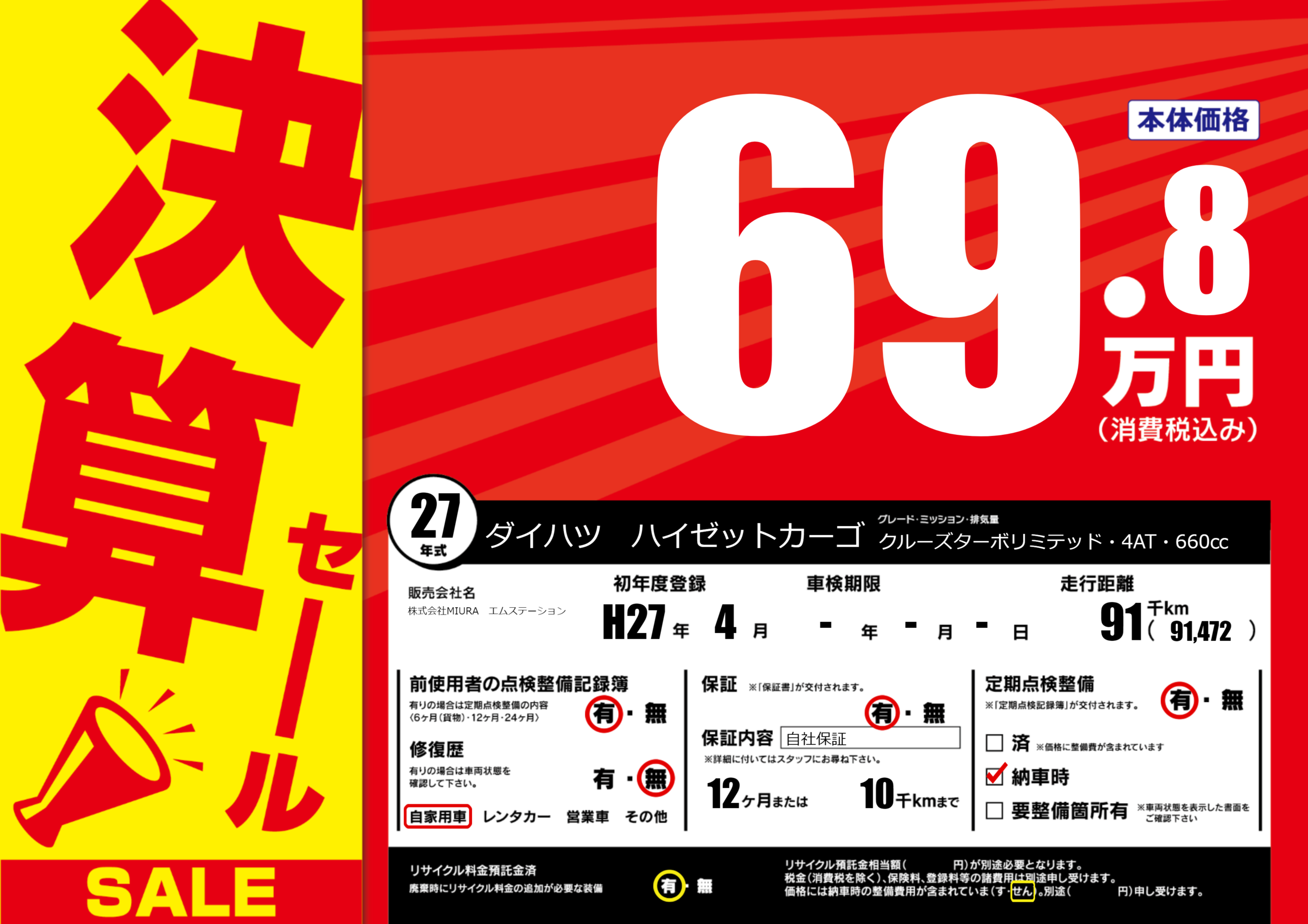 保証付き 保証内容(自社保証) 12ヶ月または(10)千kmまで |