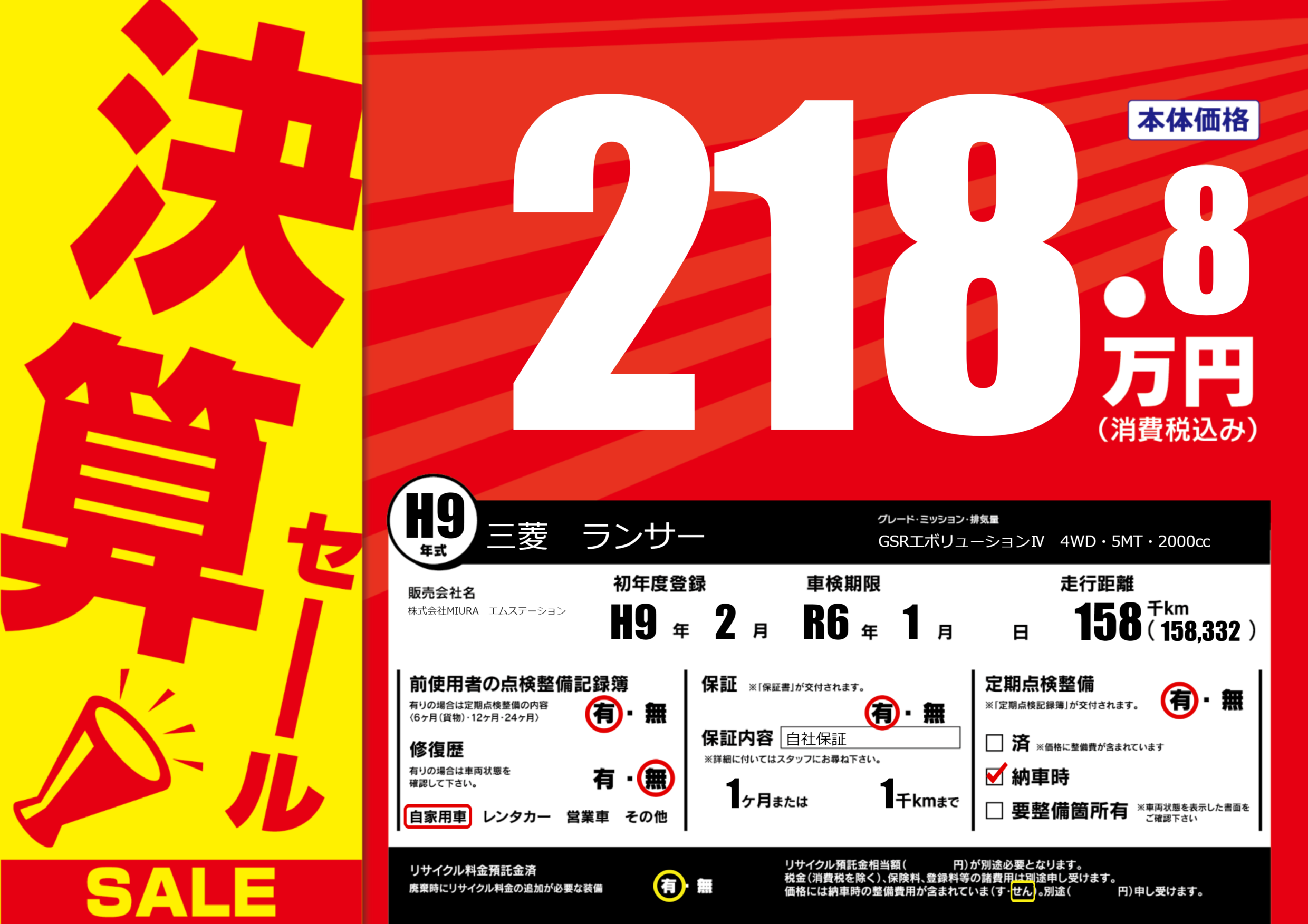 | 走行キロ | 15.8万km | 初年度登録 | H9年2月 |