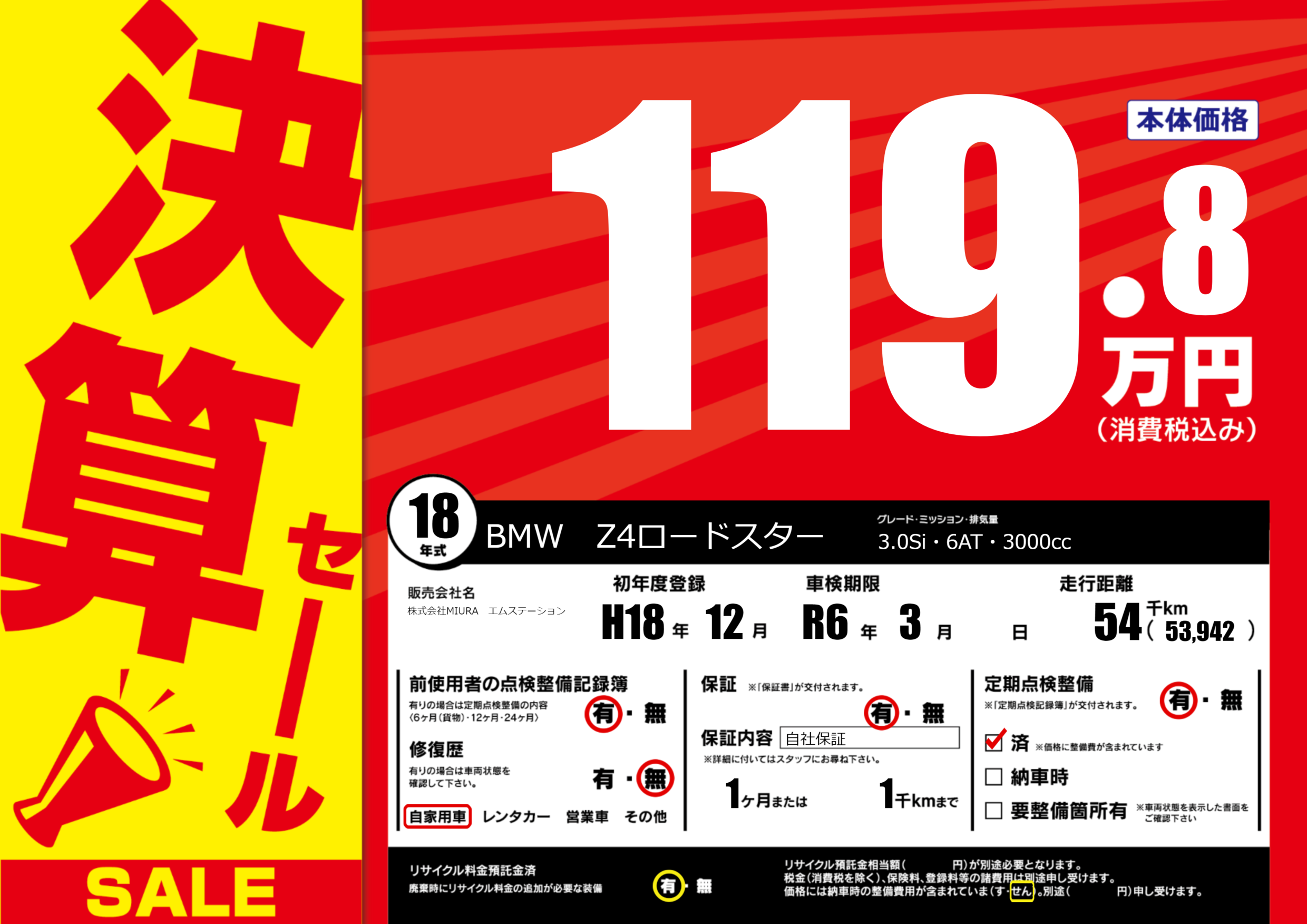 | 車名 | BMW Z4ロードスター | グレード ミッション 排気量 |