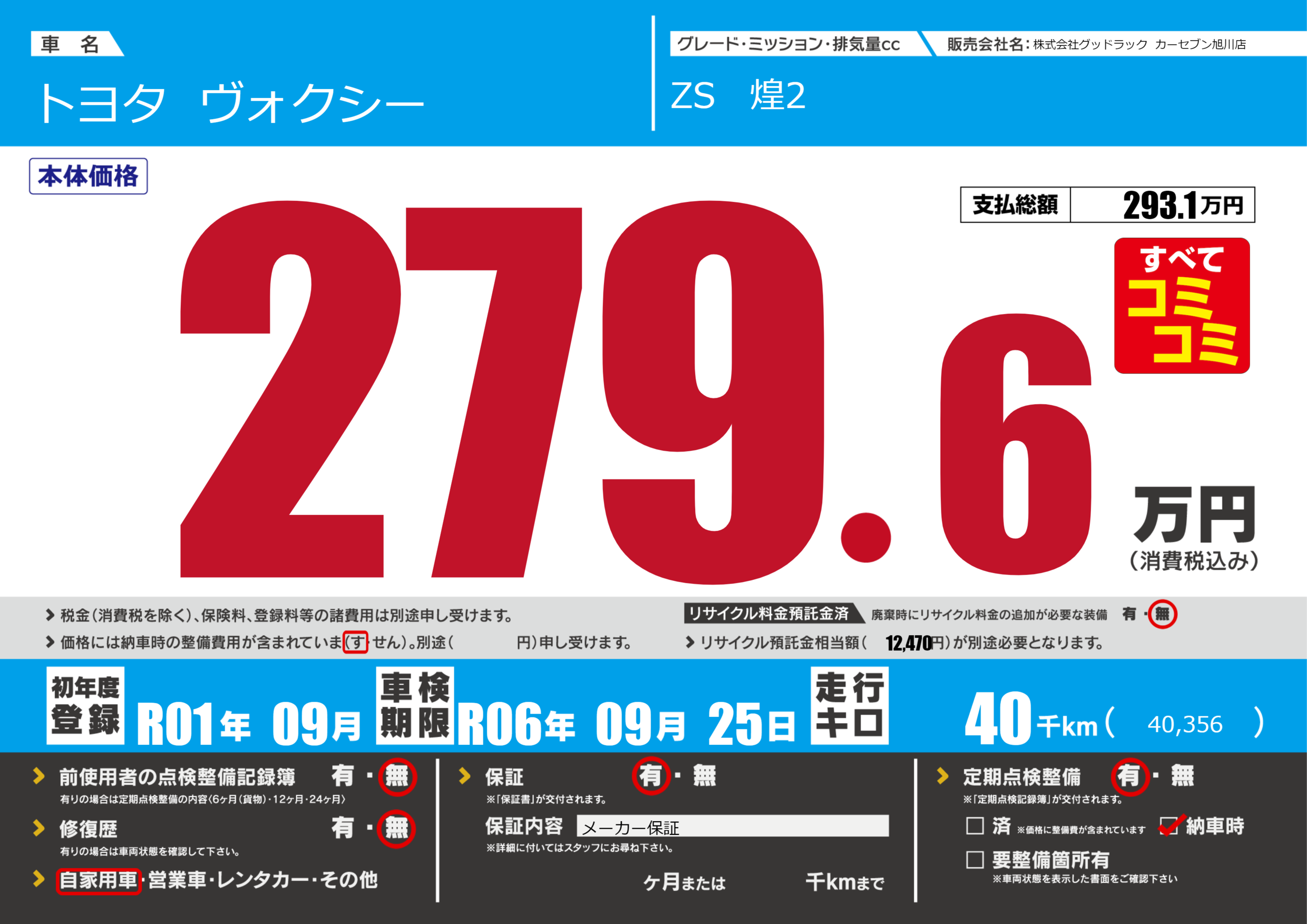 | 車名 | トヨタ ヴォクシー | グレード ミッション 排気量 |