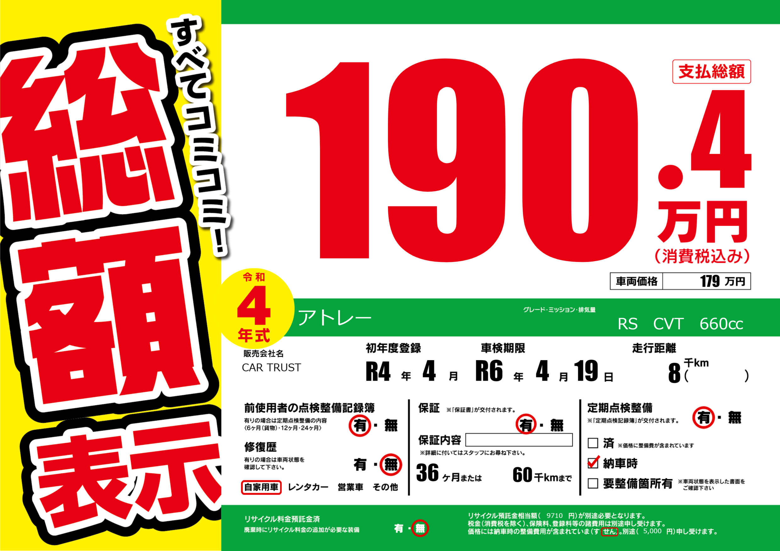 | 定期点検整備 | 定期点検整備あり 納車時あり | ||