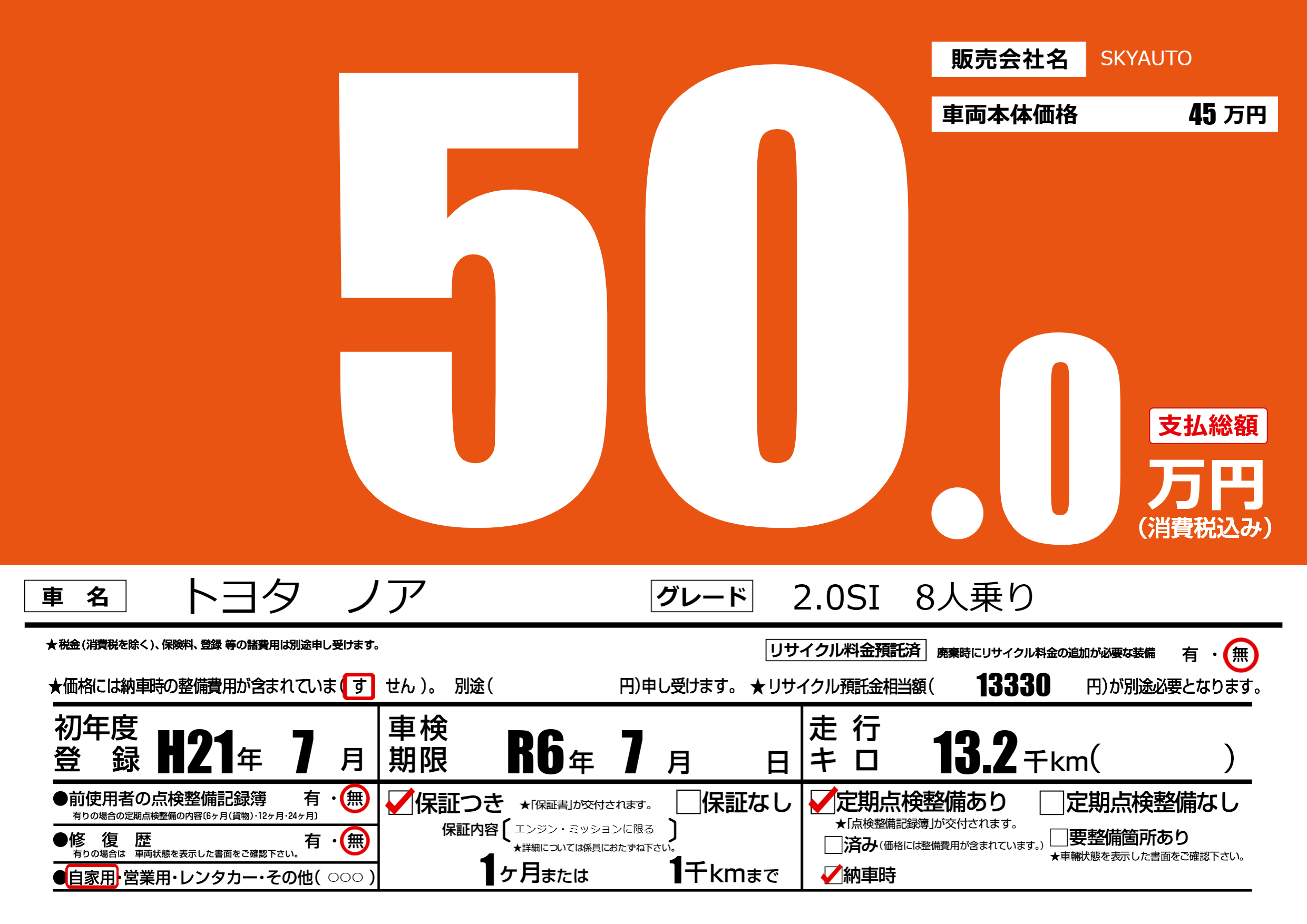 | 定期点検整備 | 定期点検整備あり 納車時あり | ||