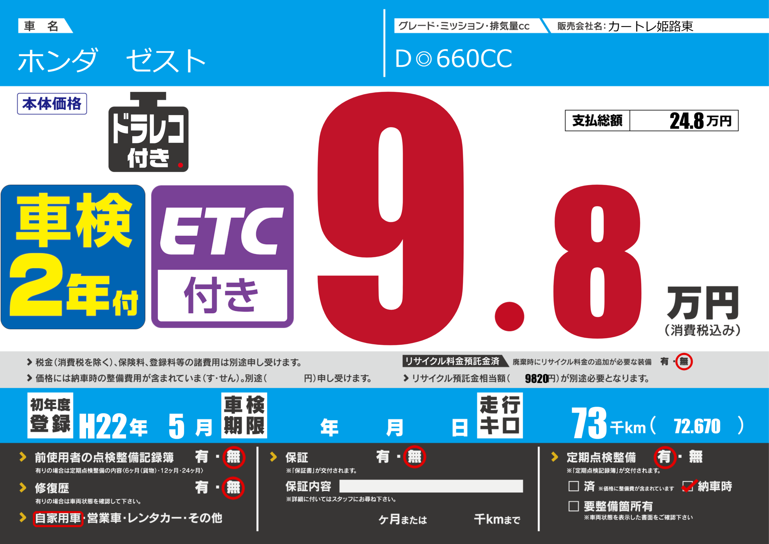 | 走行キロ | 7.3万km | 初年度登録 | H22年5月 |