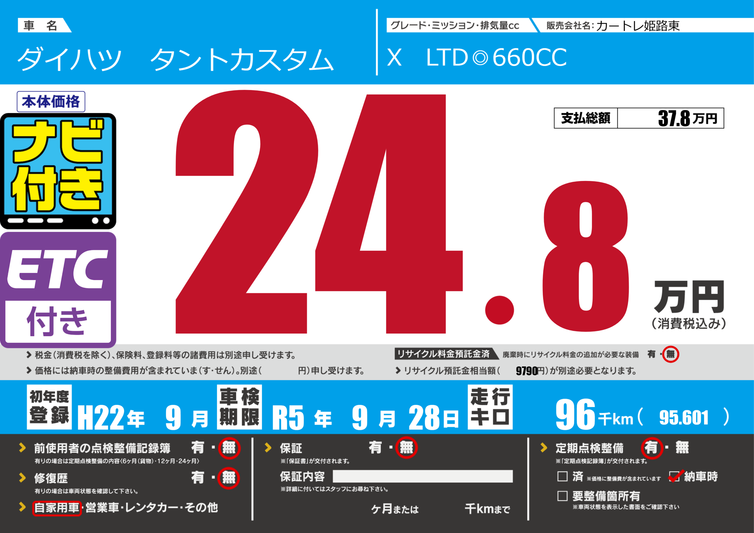 | 走行キロ | 9.6万km | 初年度登録 | H22年9月 |