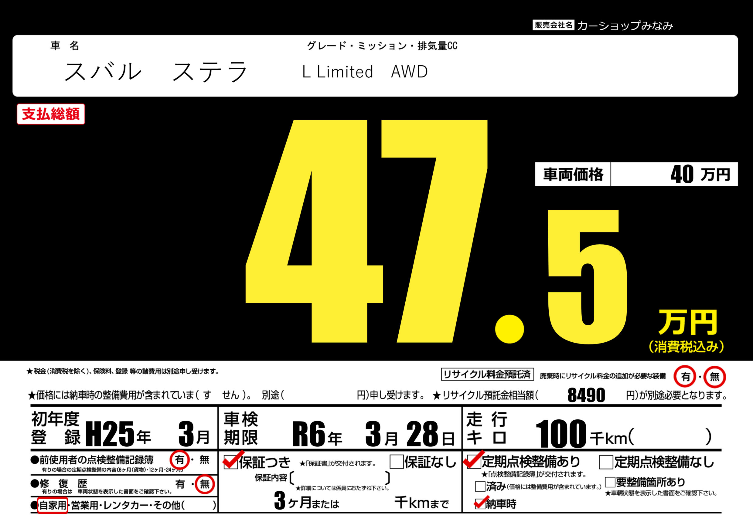 | 車名 | スバル ステラ | グレード ミッション 排気量 |
