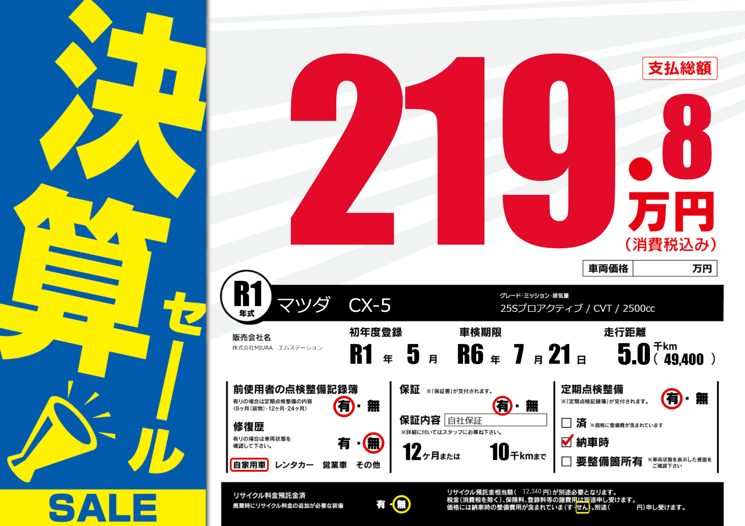 | 定期点検整備 | 定期点検整備あり 納車時あり | ||