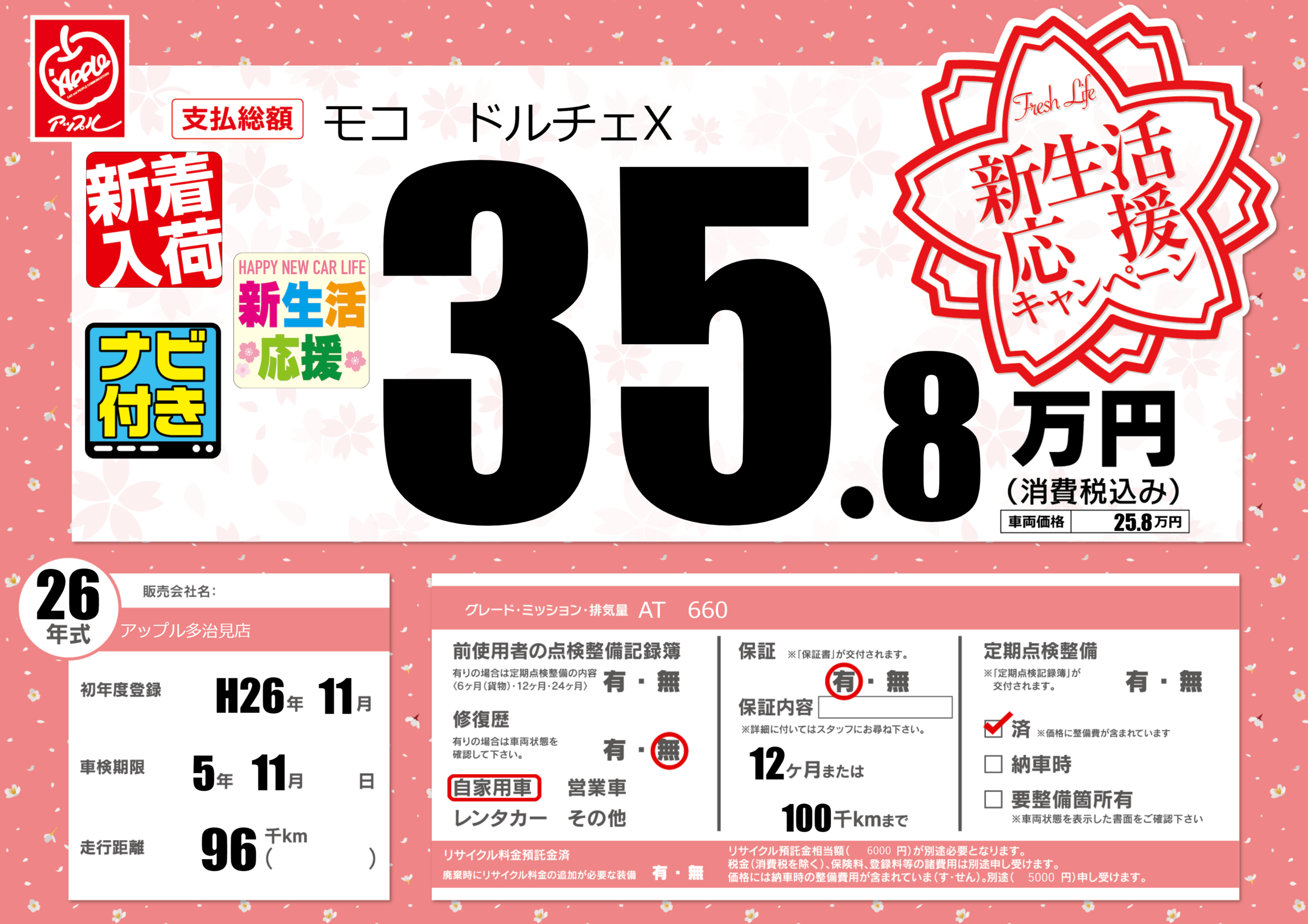 | 車名 | モコ ドルチェX | グレード ミッション 排気量 |