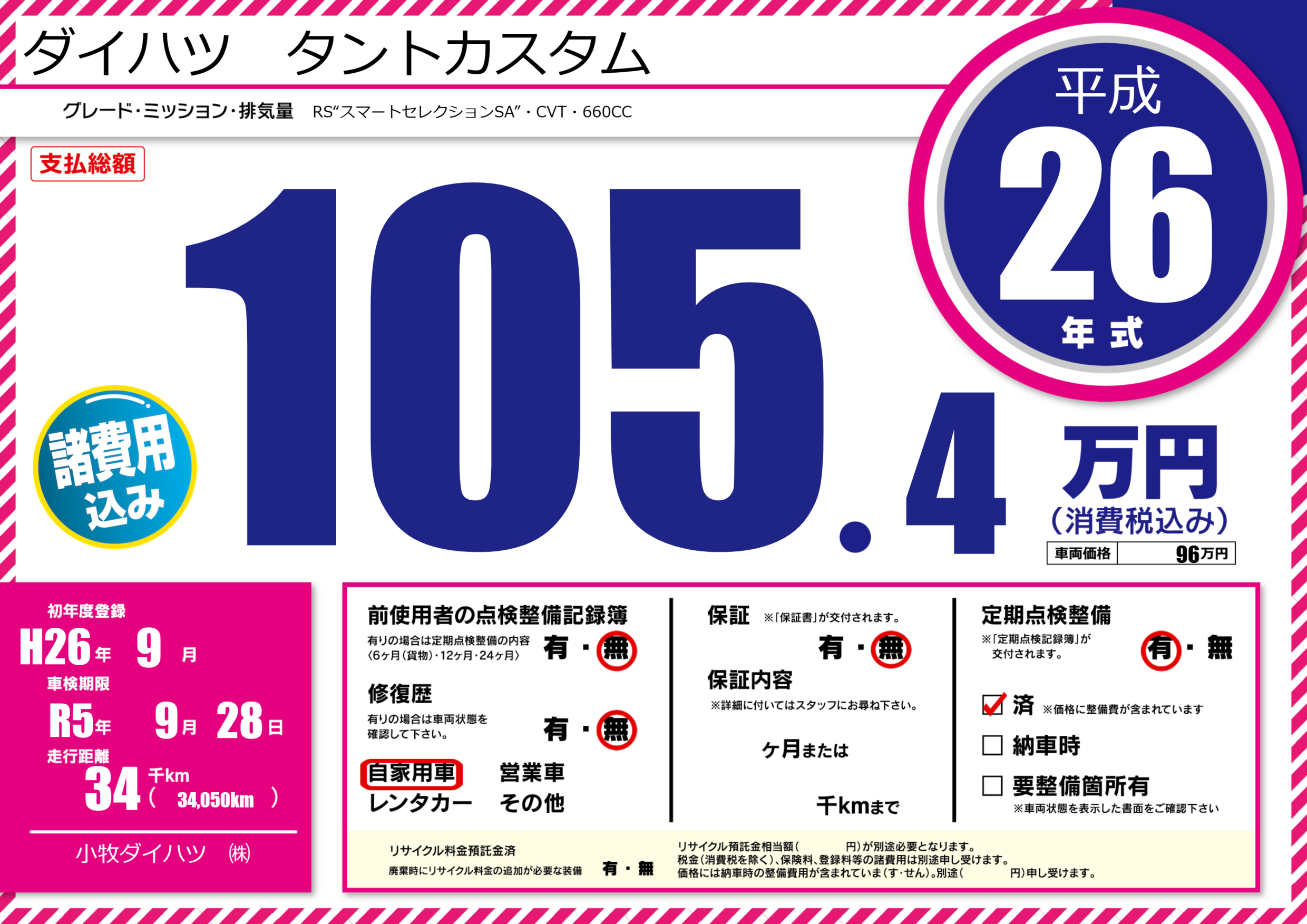 | 走行キロ | 3.4万km | 初年度登録 | H26年9月 |