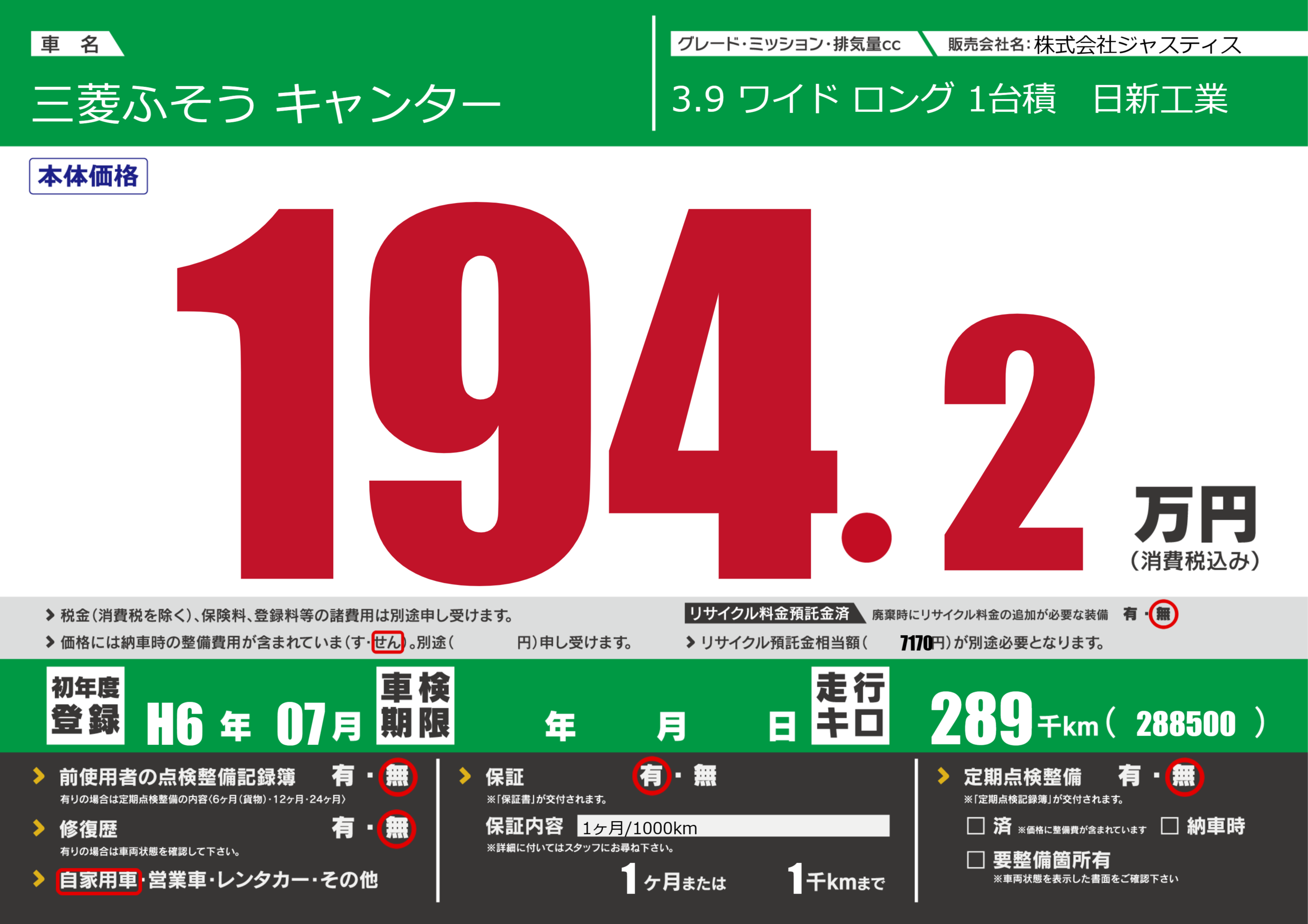 | 車名 | 三菱ふそう キャンター | グレード ミッション 排気量 |