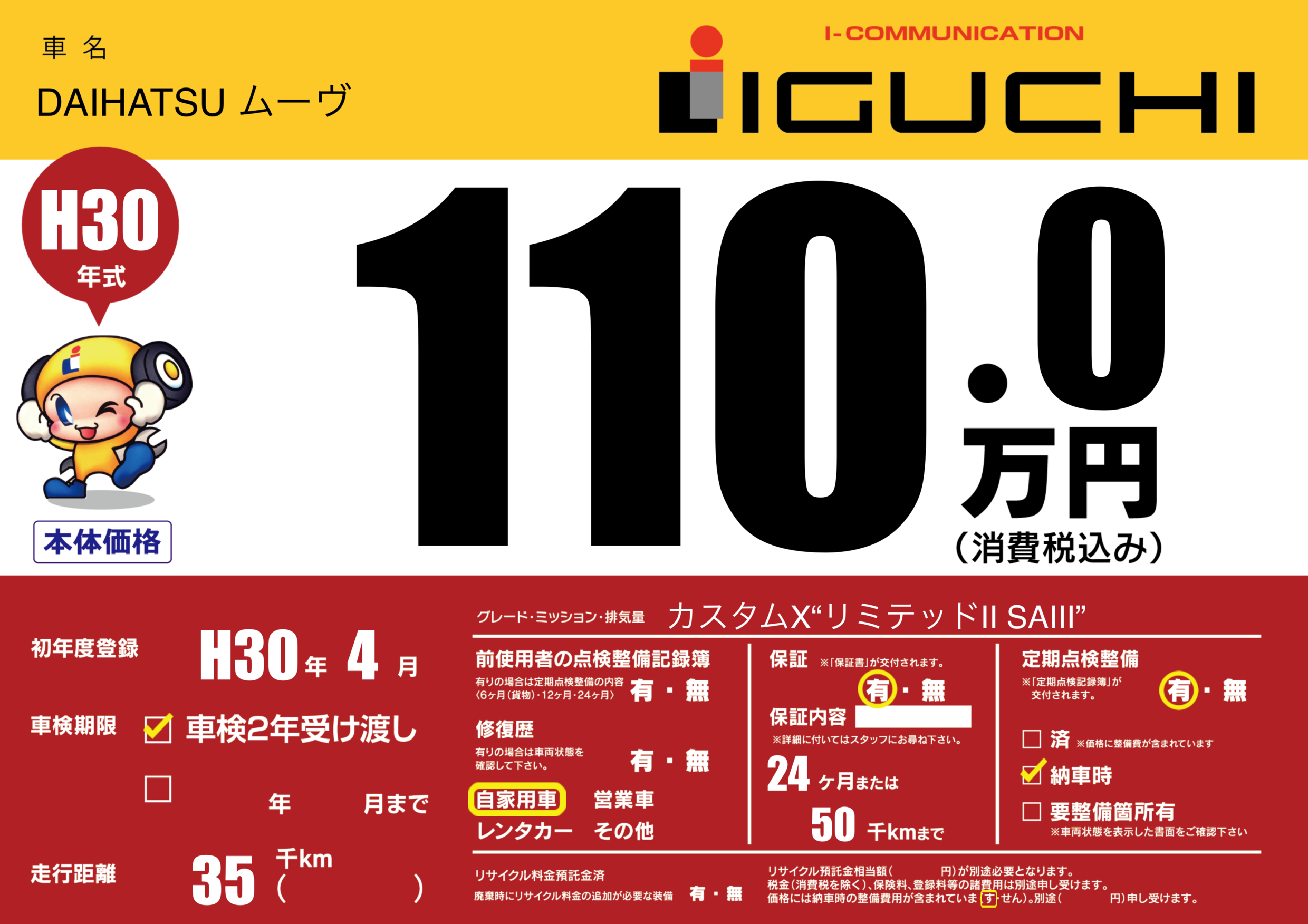 保証付き 保証内容(---) 24ヶ月または(50)千kmまで |