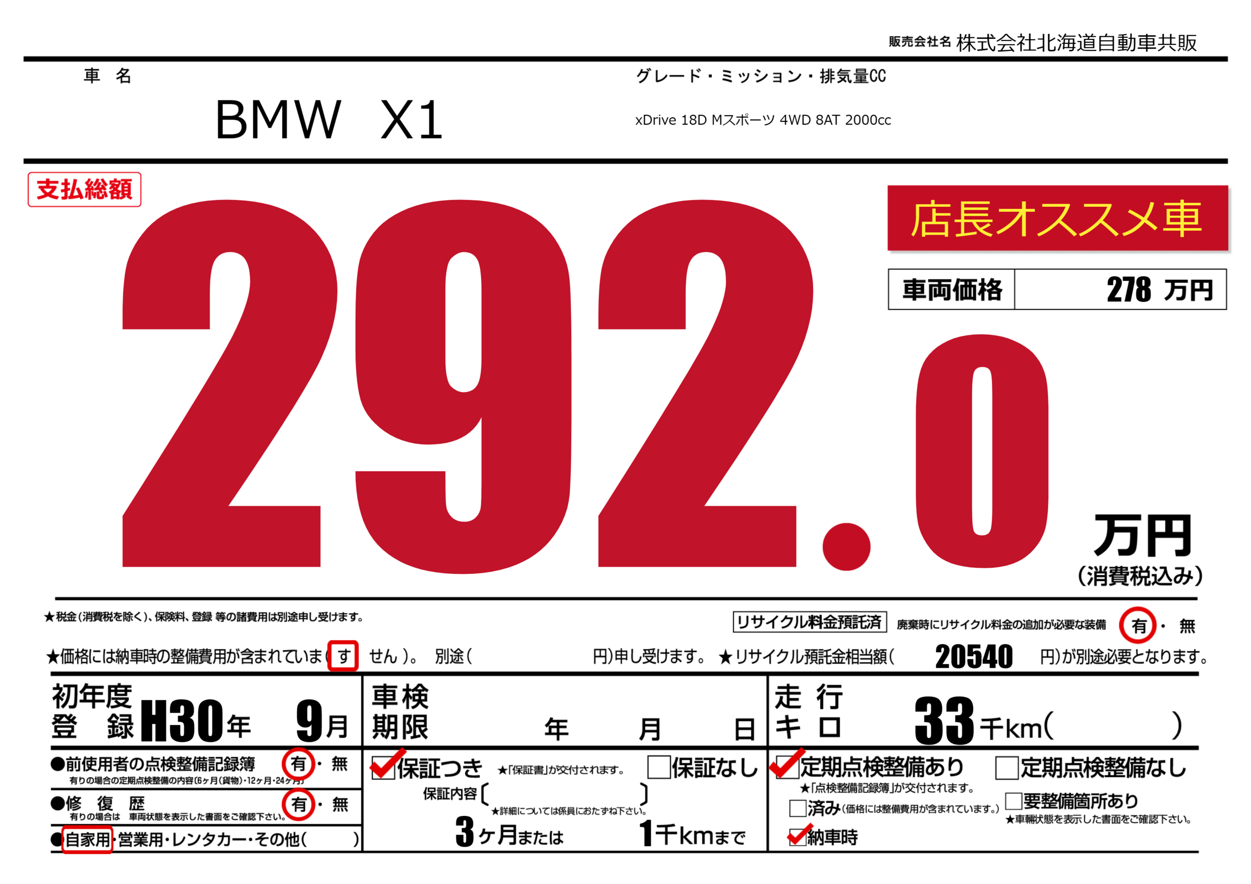 | 車名 | BMW X1 | グレード ミッション 排気量 |