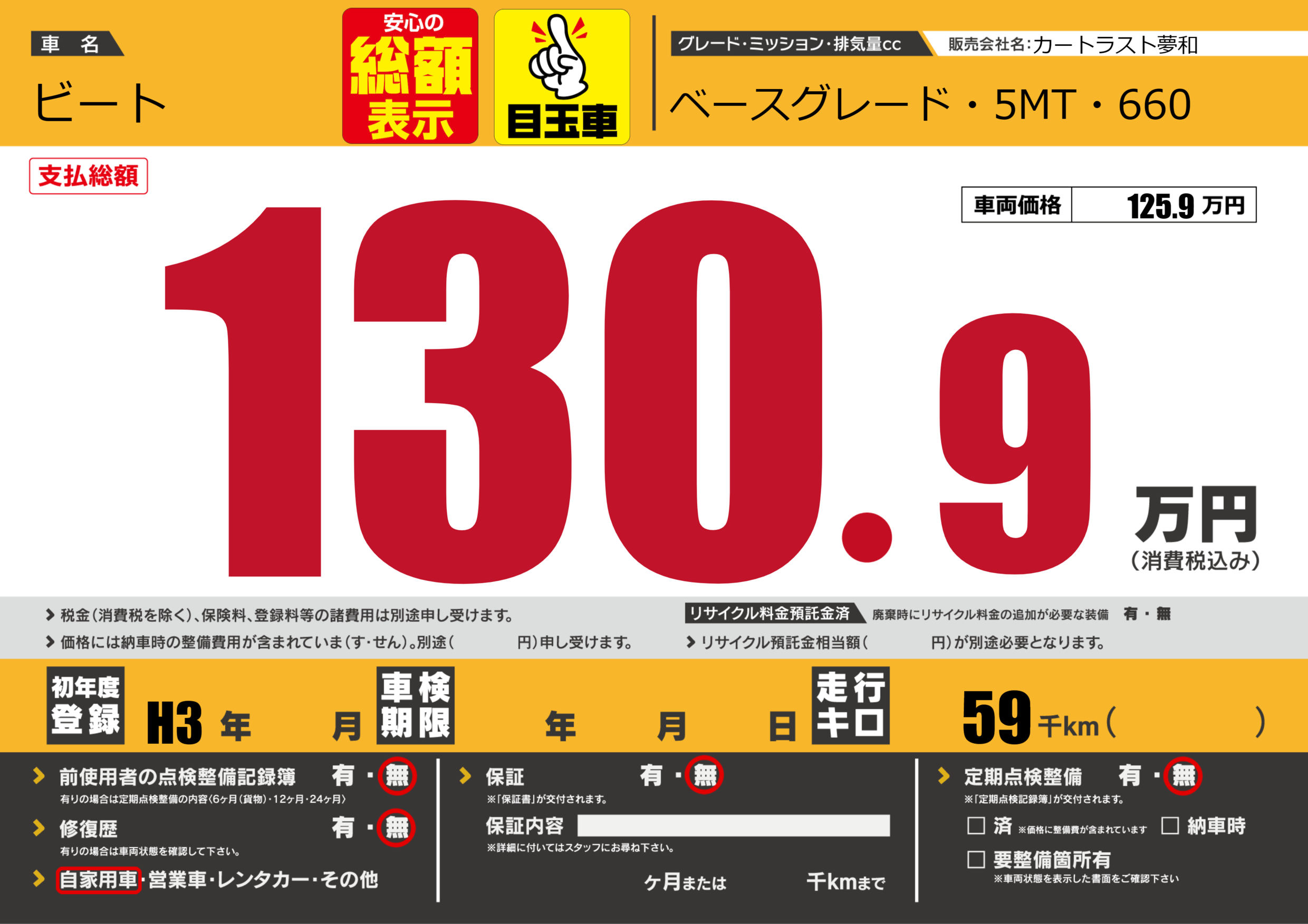 | 車名 | ビート | グレード ミッション 排気量 |