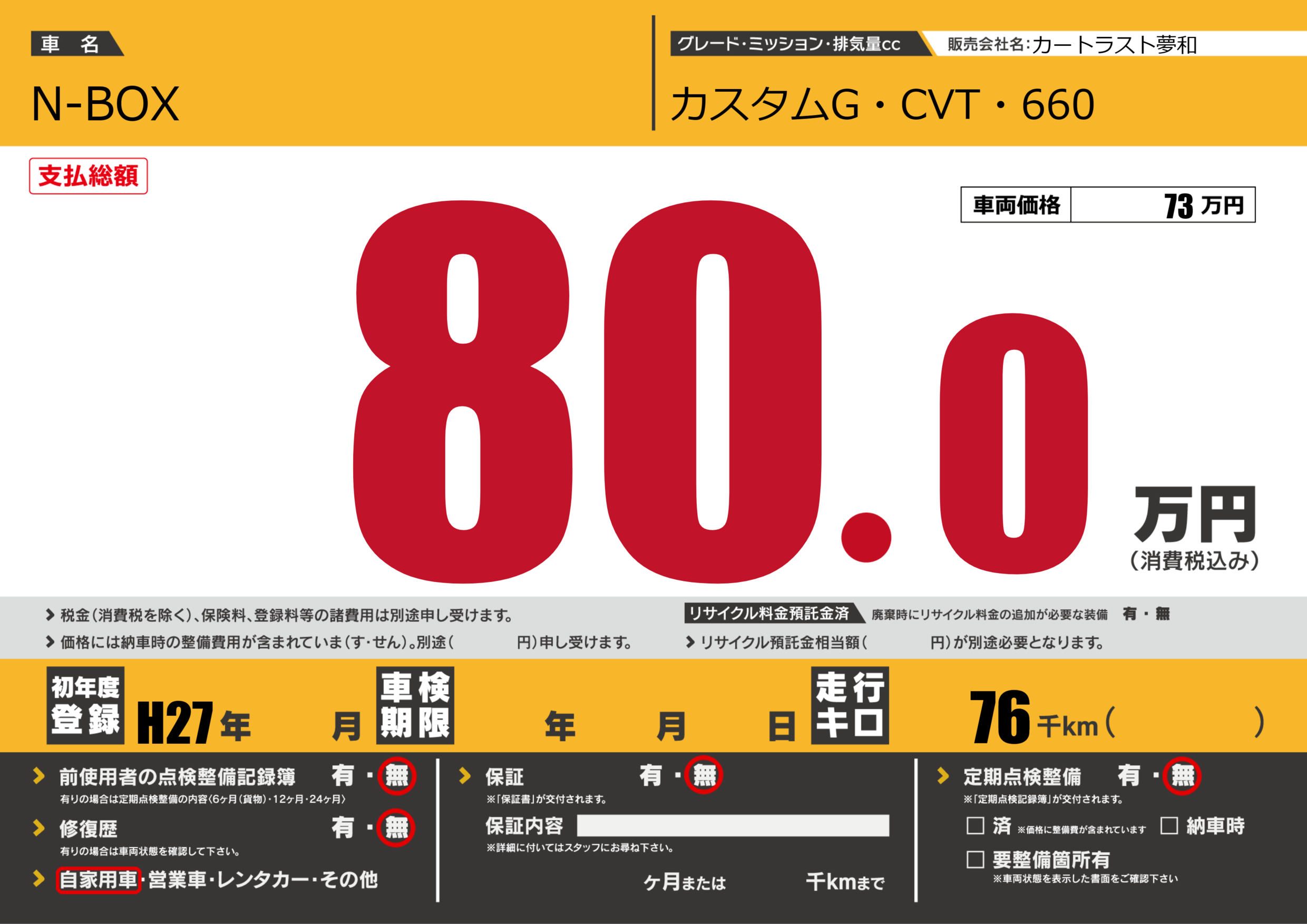 | 走行キロ | 7.6万km | 初年度登録 | H27年---月 |
