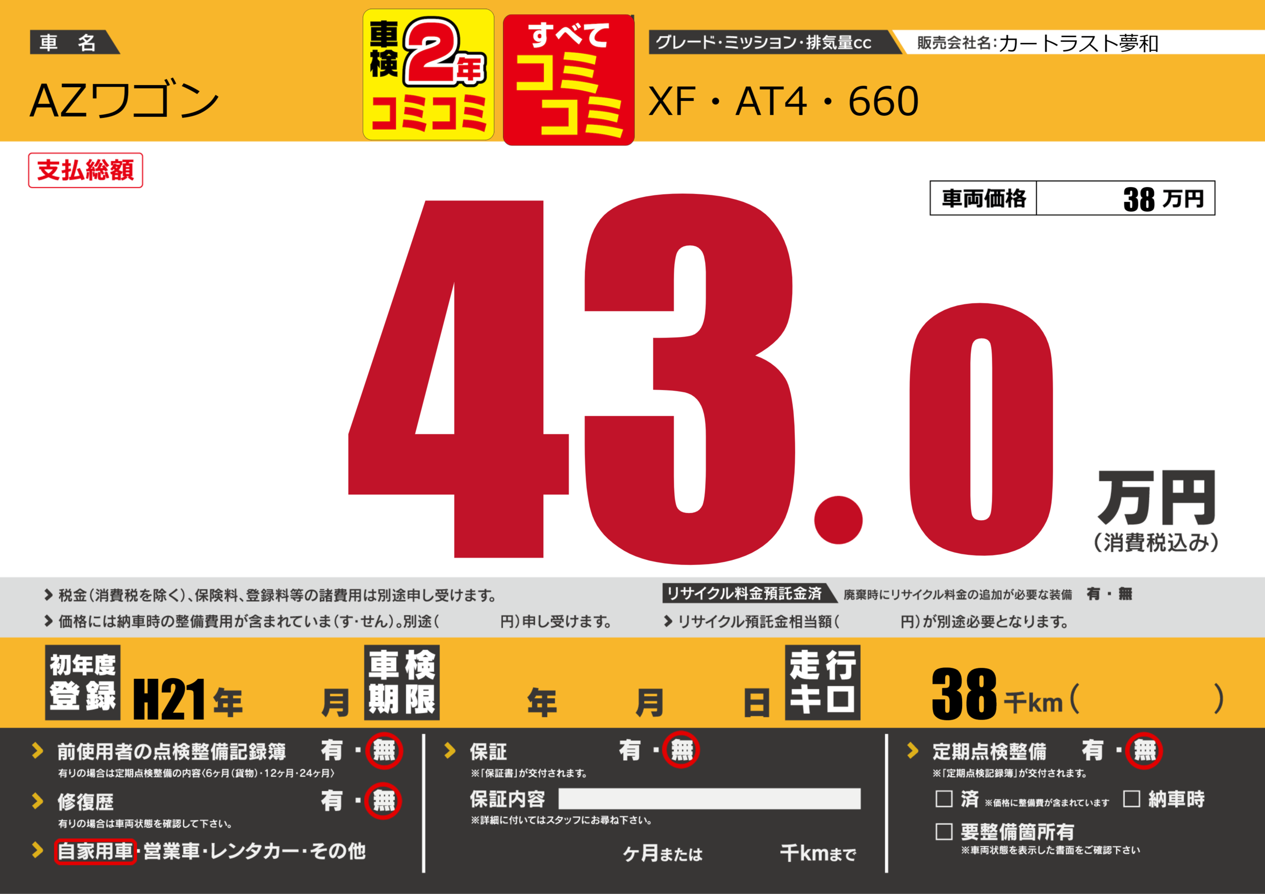 | 走行キロ | 3.8万km | 初年度登録 | H21年---月 |