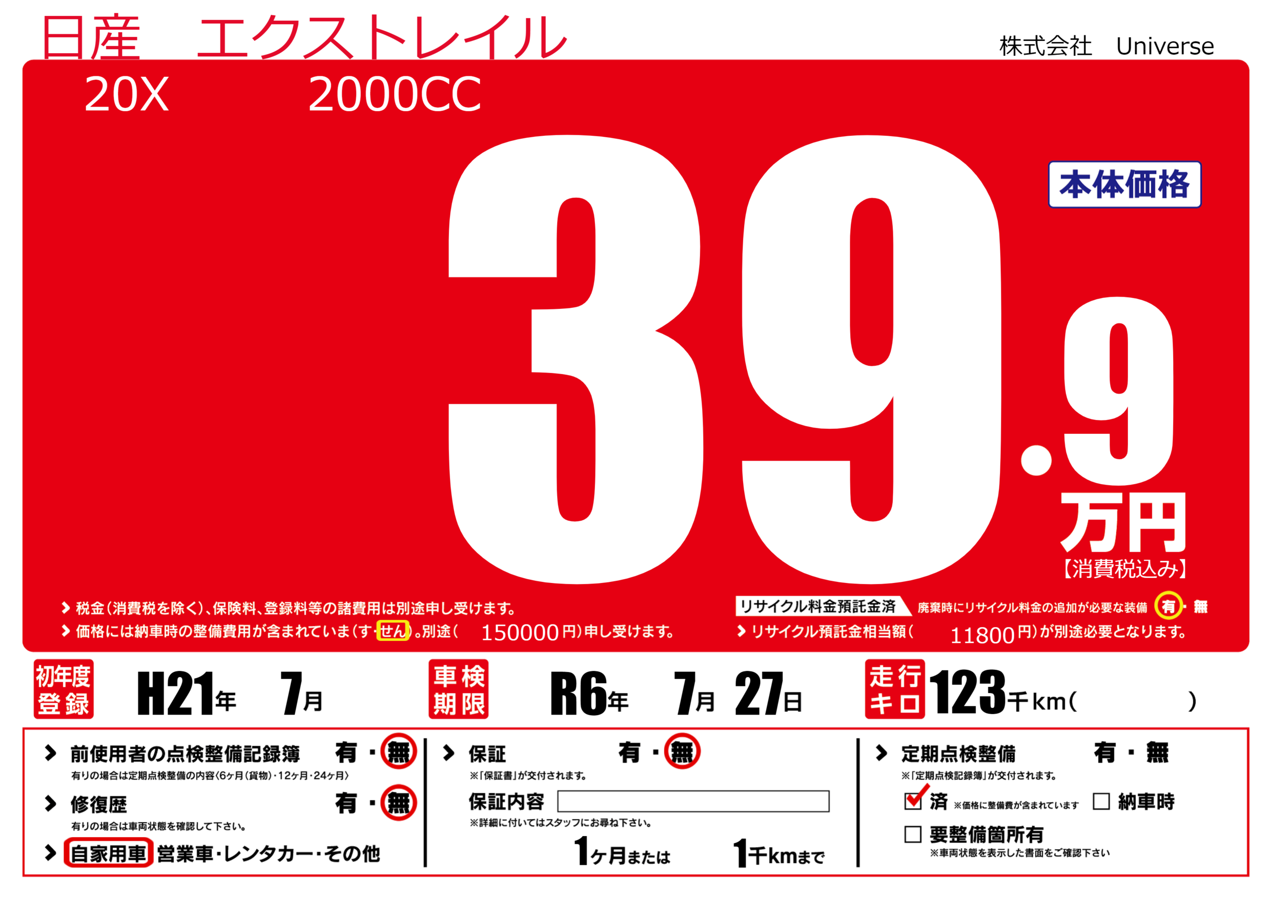 | 定期点検整備 | 定期点検整備済み | ||