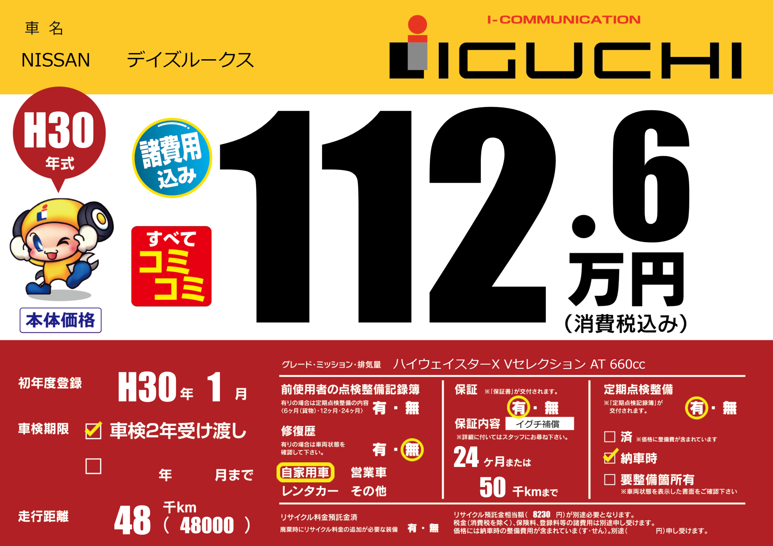 保証付き 保証内容(イグチ補償) 24ヶ月または(50)千kmまで |