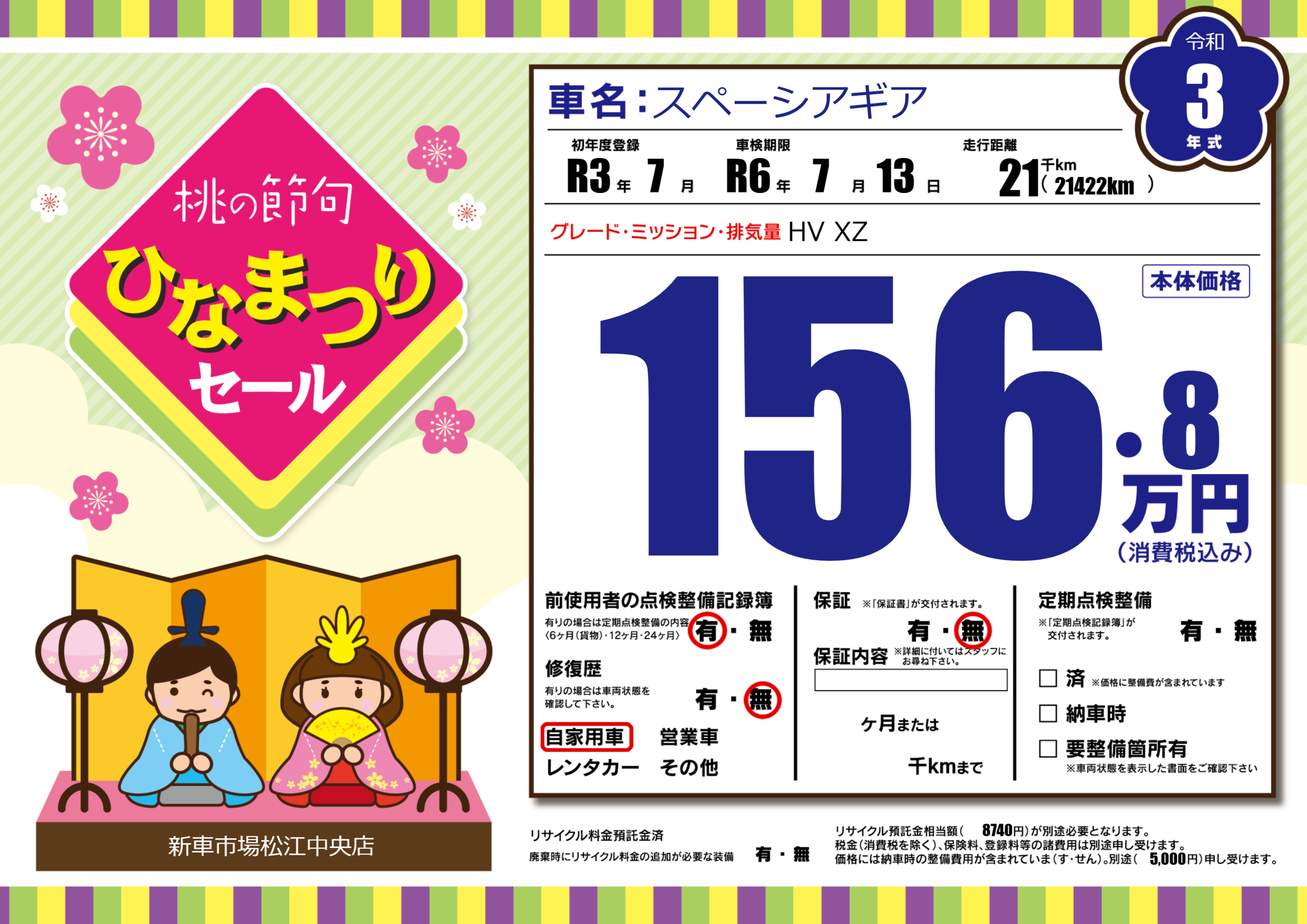 | 走行キロ | 2.1万km | 初年度登録 | R3年7月 |
