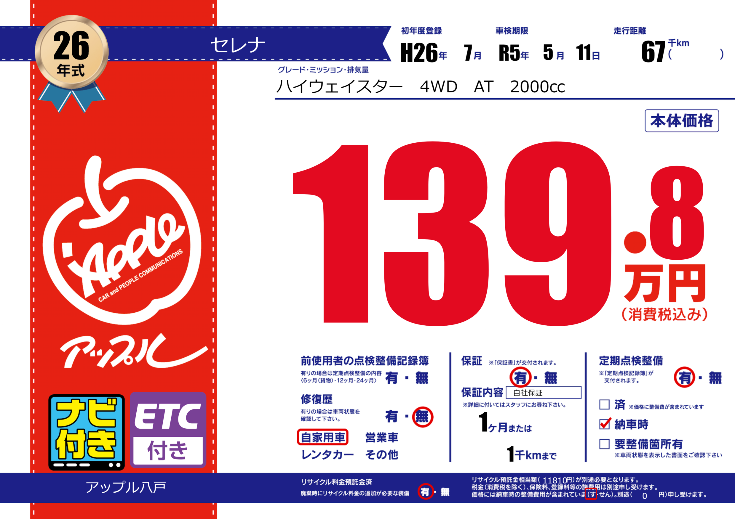| 走行キロ | 6.7万km | 初年度登録 | H26年7月 |