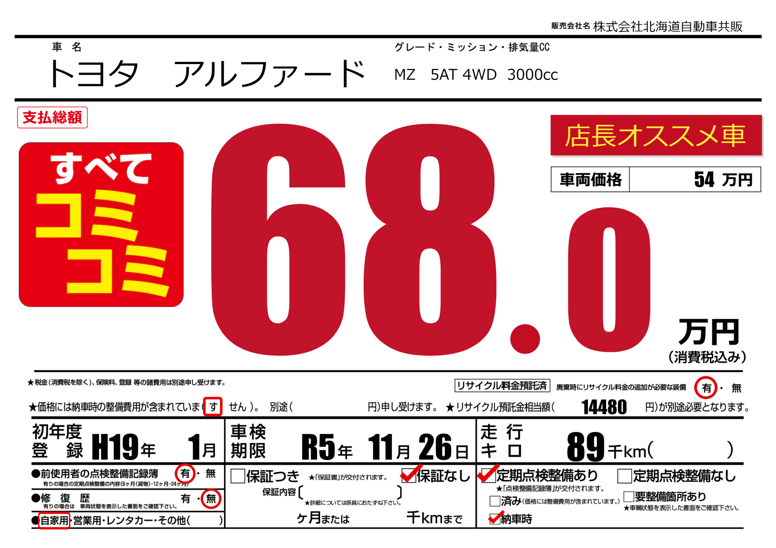| 走行キロ | 8.9万km | 初年度登録 | H19年1月 |
