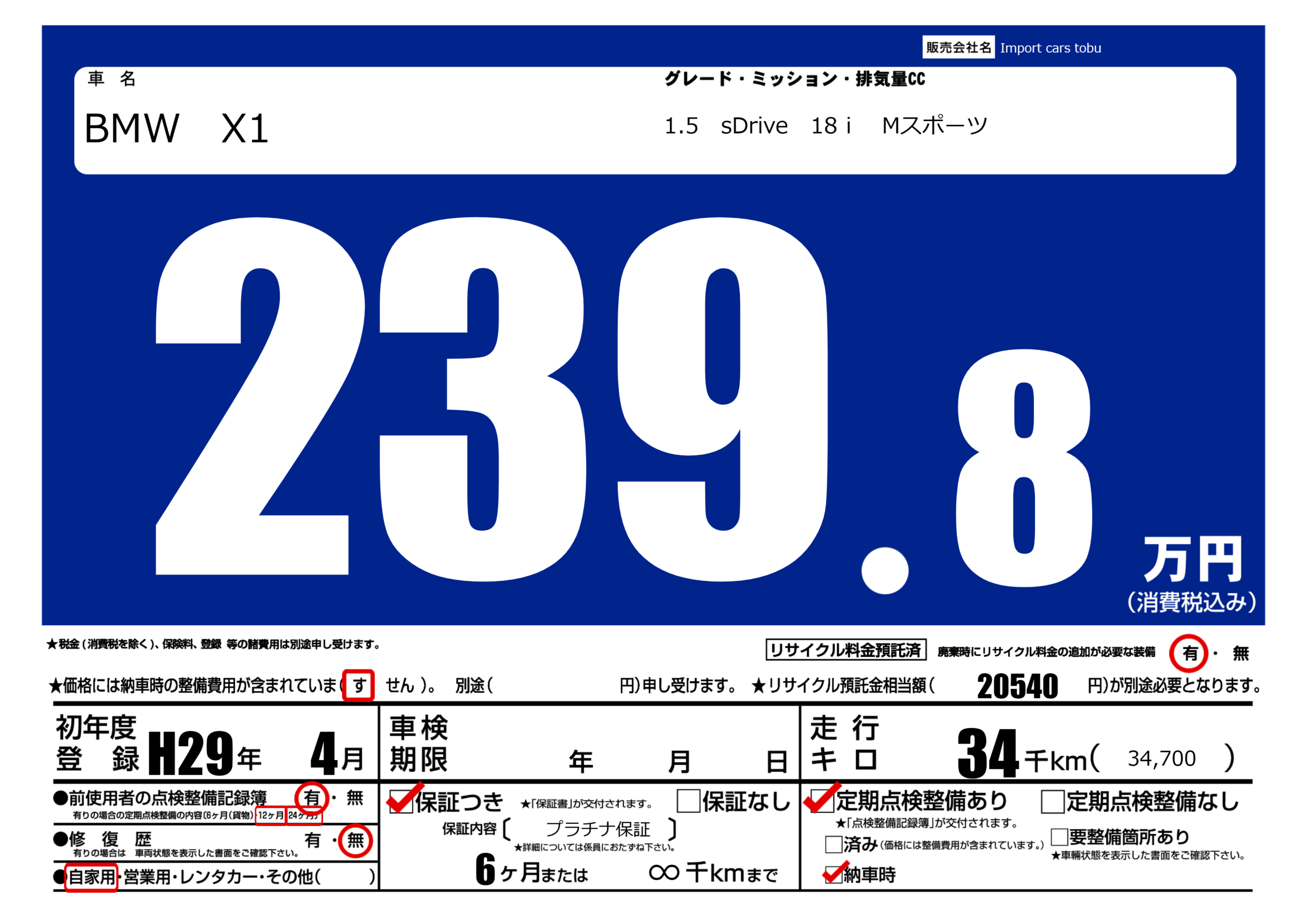 保証付き 保証内容( プラチナ保証) 6ヶ月または(∞)千kmまで |