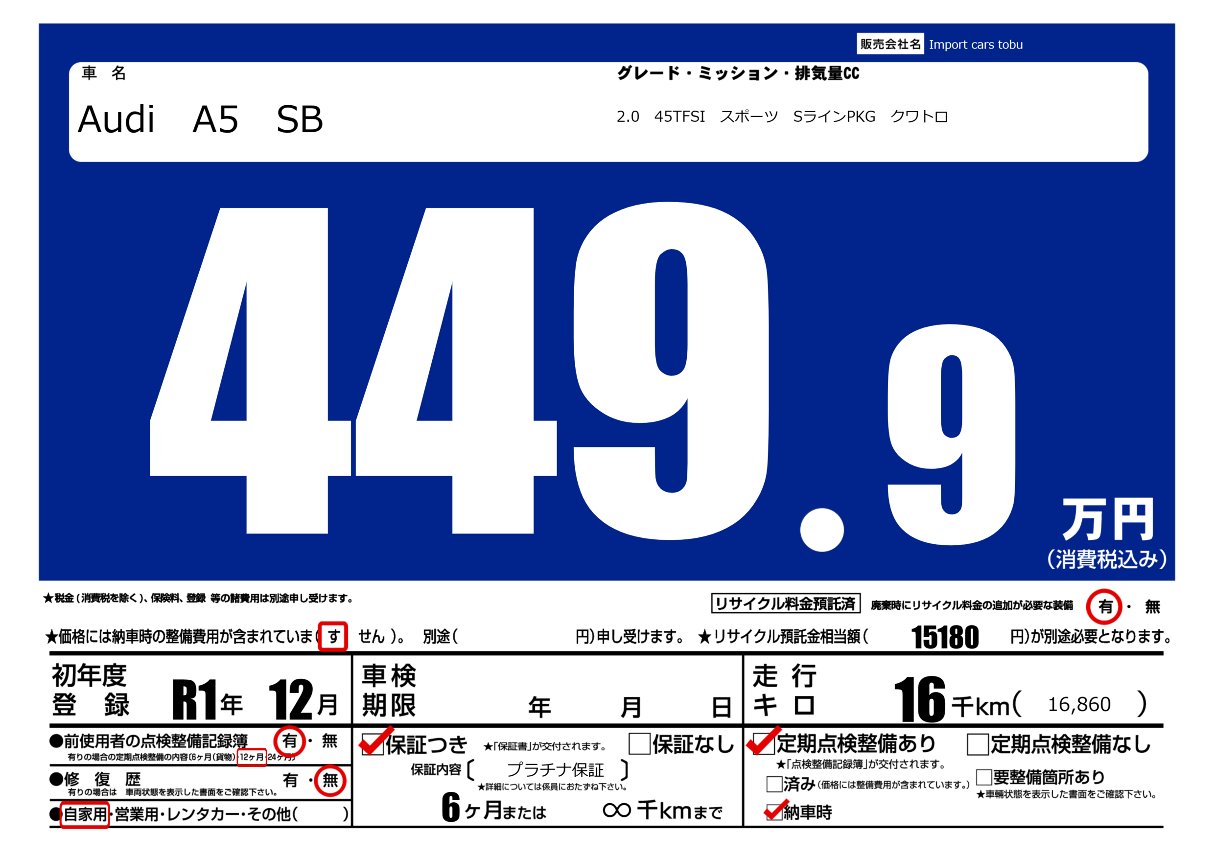 | 車名 | Audi A5 SB | グレード ミッション 排気量 |