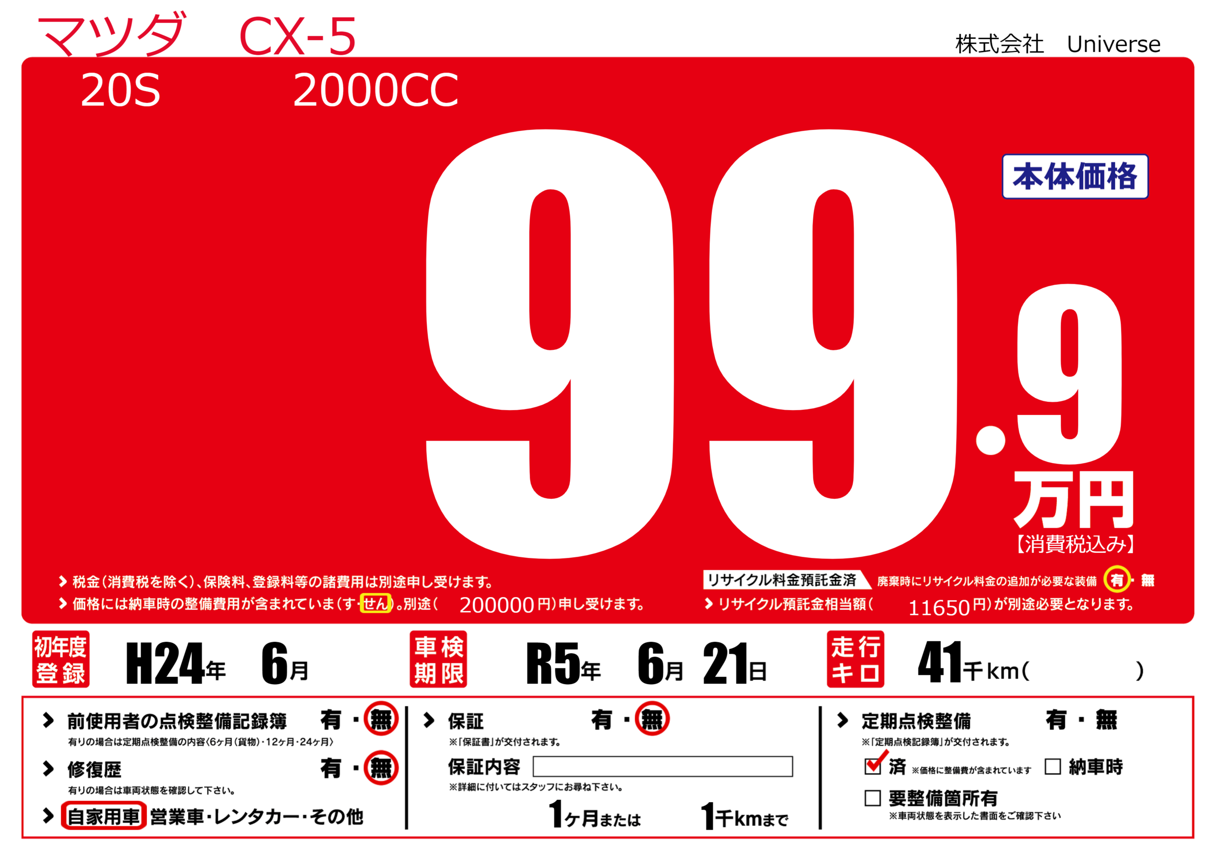 | 定期点検整備 | 定期点検整備済み | ||