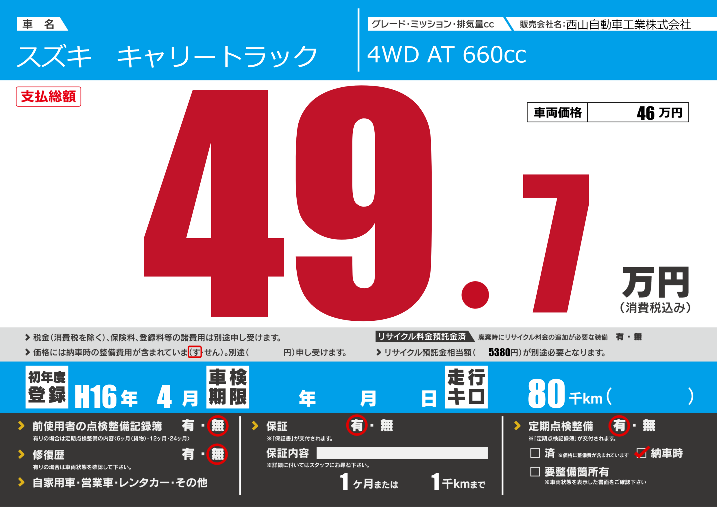 | 定期点検整備 | 定期点検整備あり 納車時あり | ||