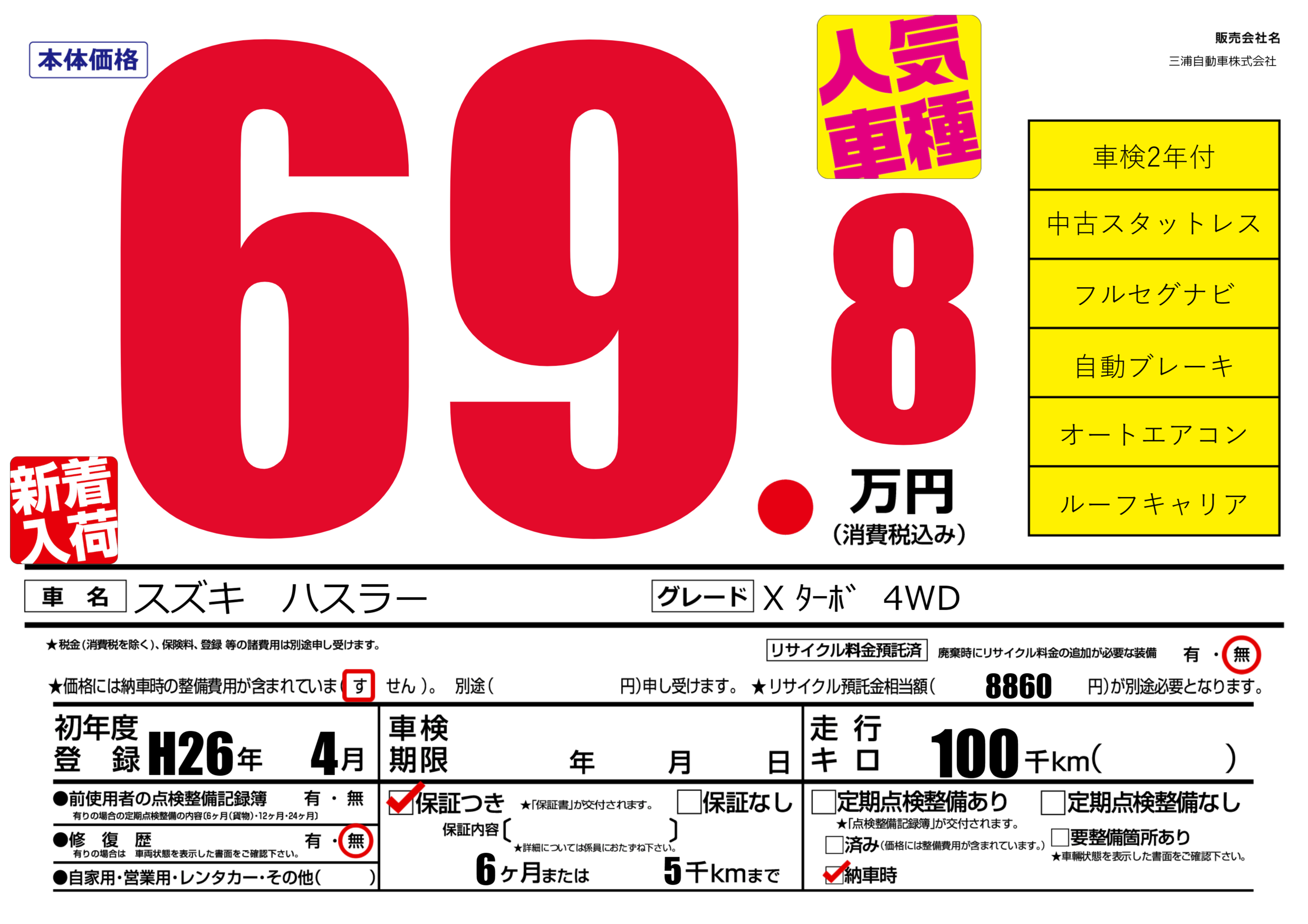 保証付き 保証内容(---) 6ヶ月または(5)千kmまで |