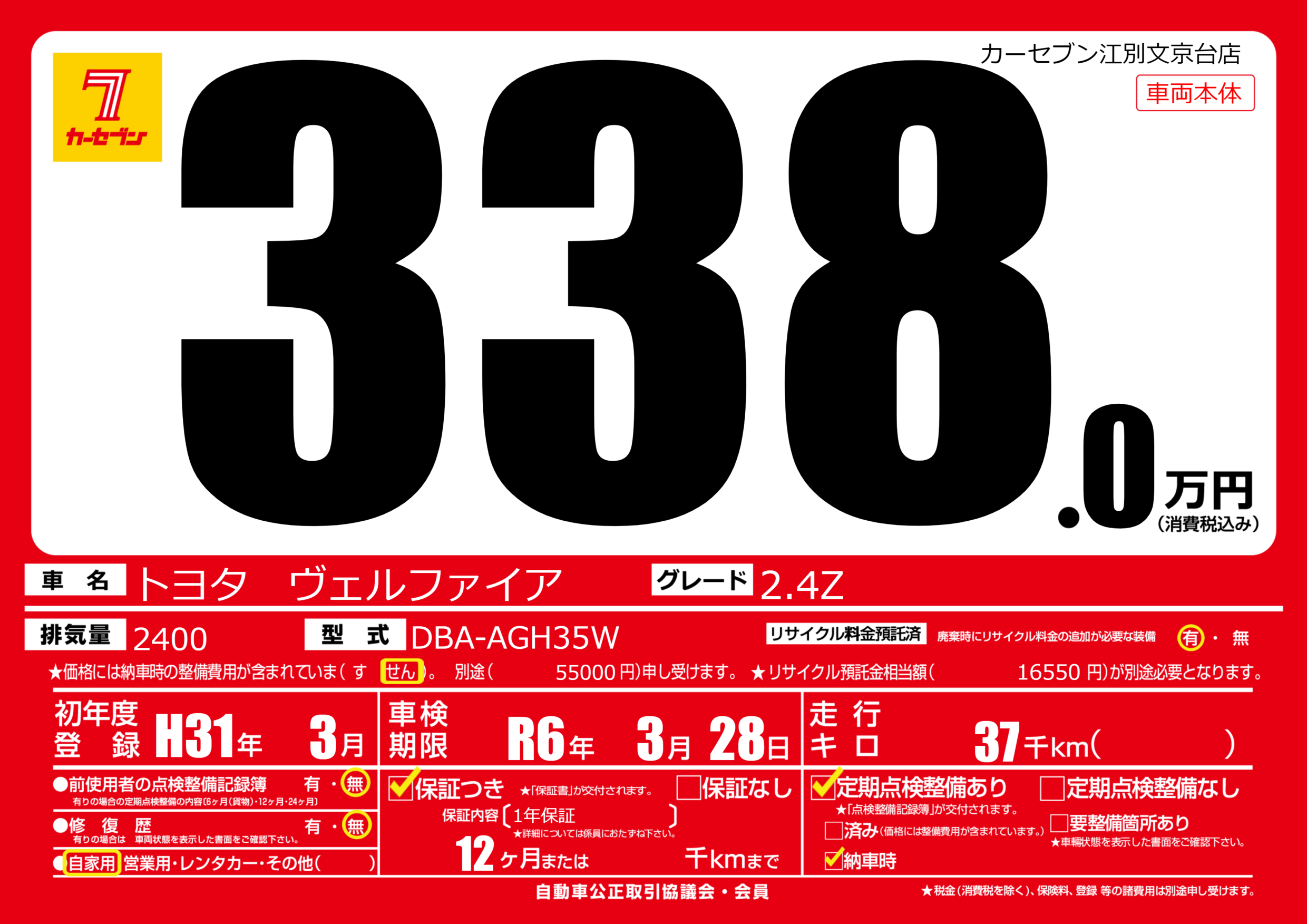| 車名 | トヨタ ヴェルファイア | グレード ミッション 排気量 |