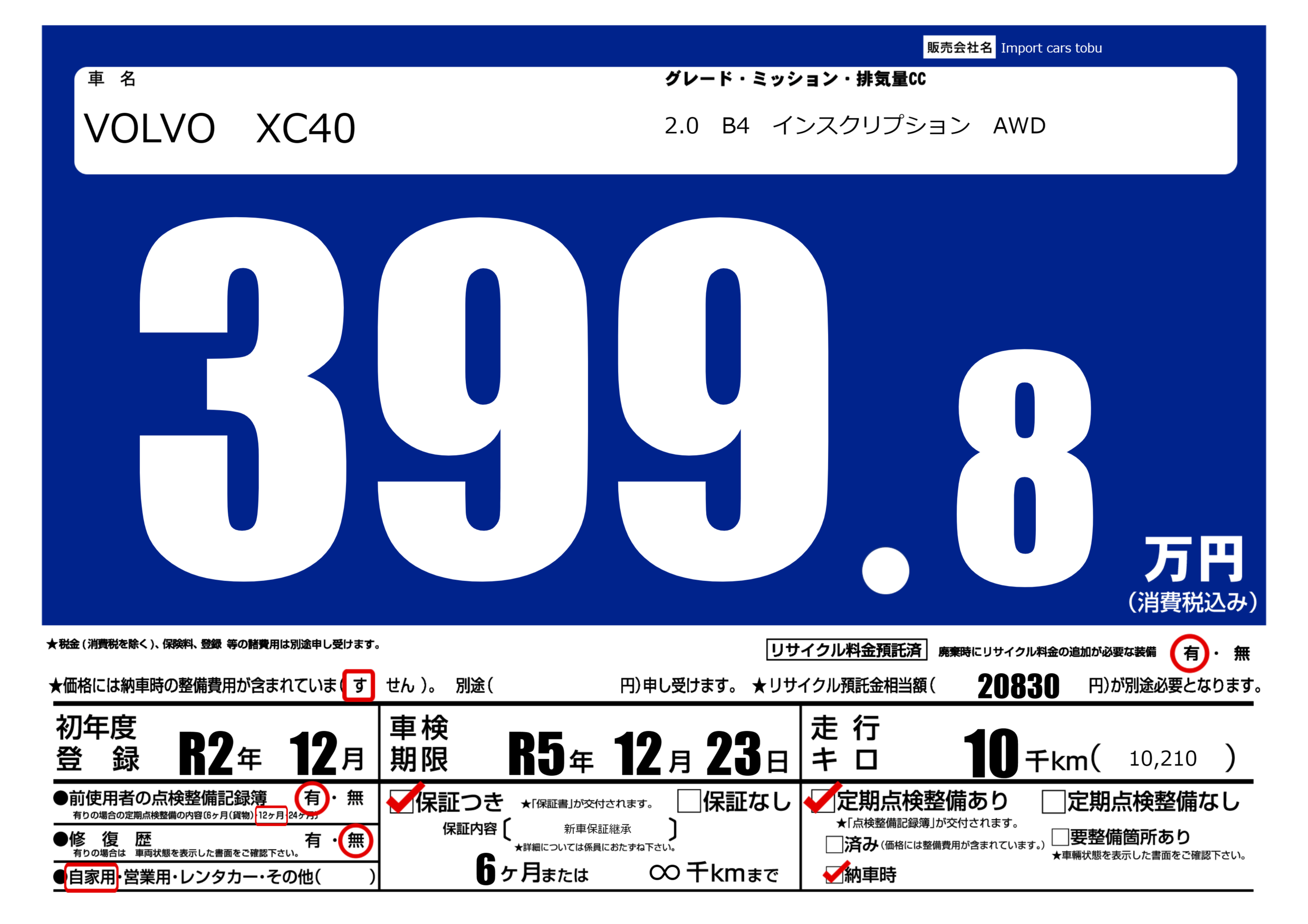 | 車名 | VOLVO XC40 | グレード ミッション 排気量 |