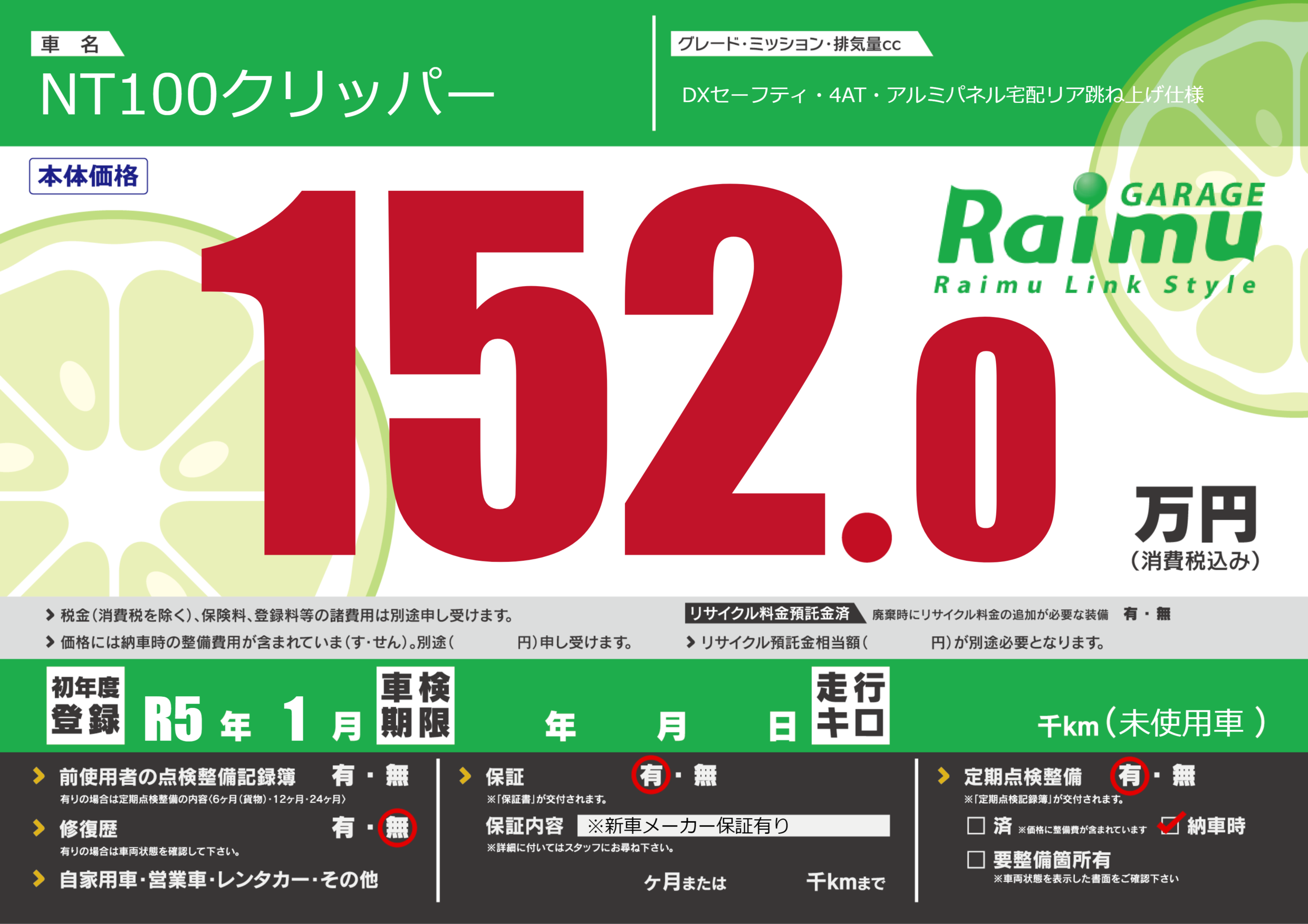 | 車名 | NT100クリッパー | グレード ミッション 排気量 |