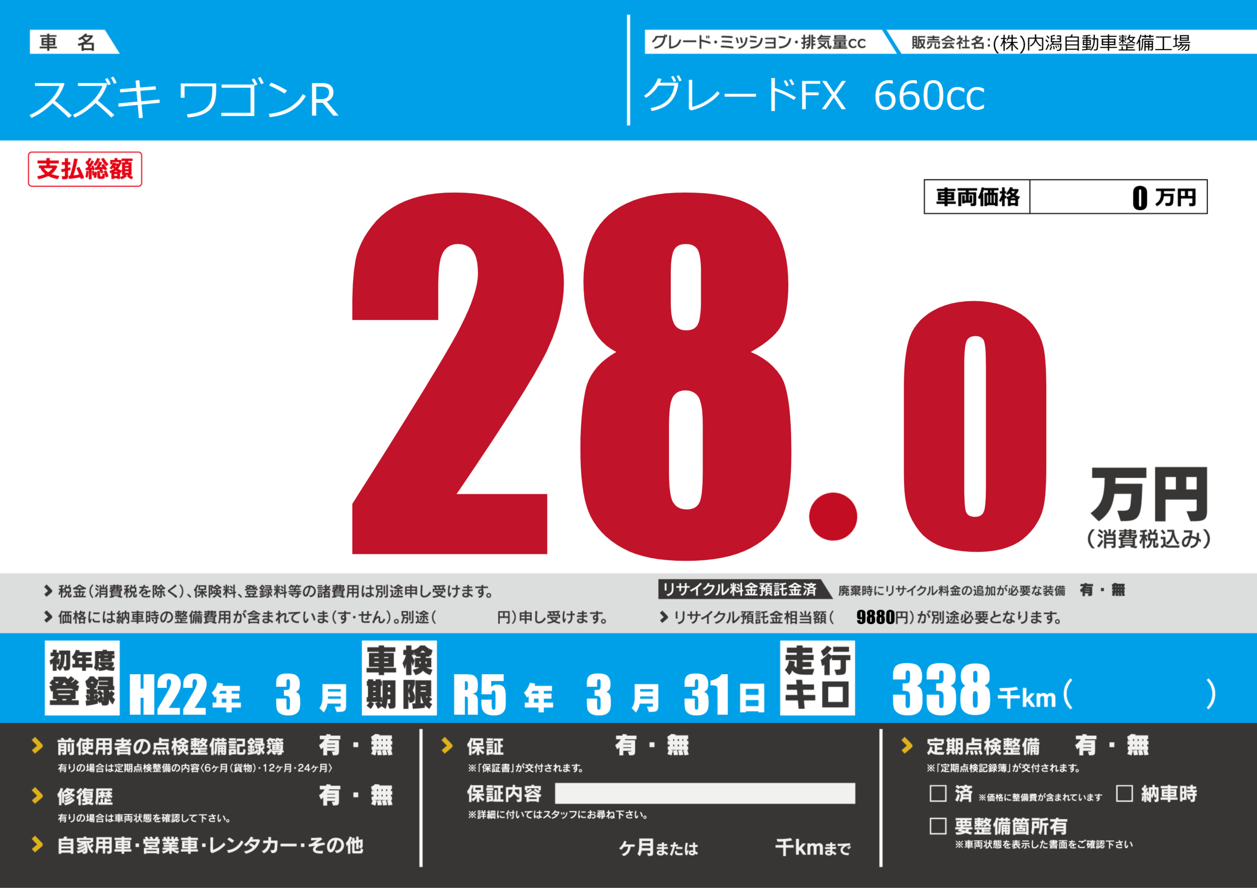 | 車名 | スズキ ワゴンR | グレード ミッション 排気量 |
