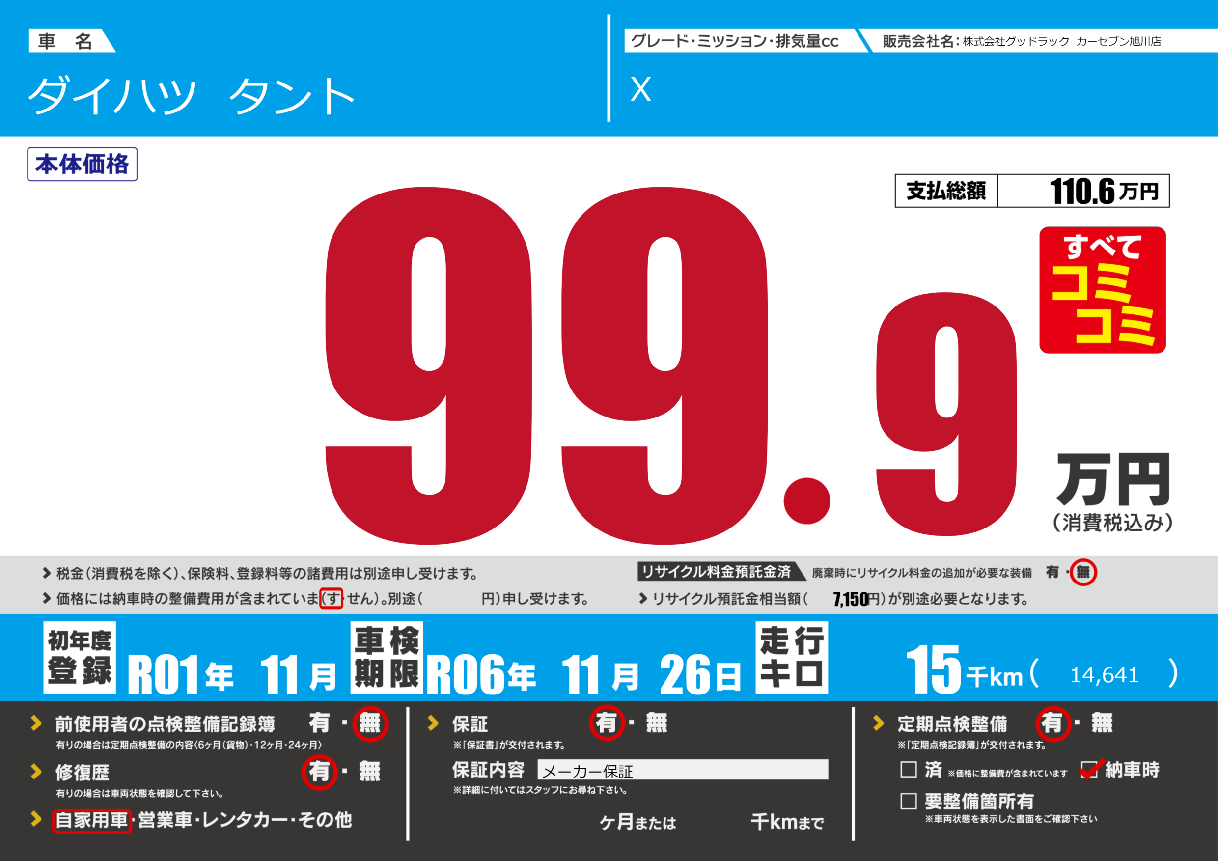 | 車名 | ダイハツ タント | グレード ミッション 排気量 |