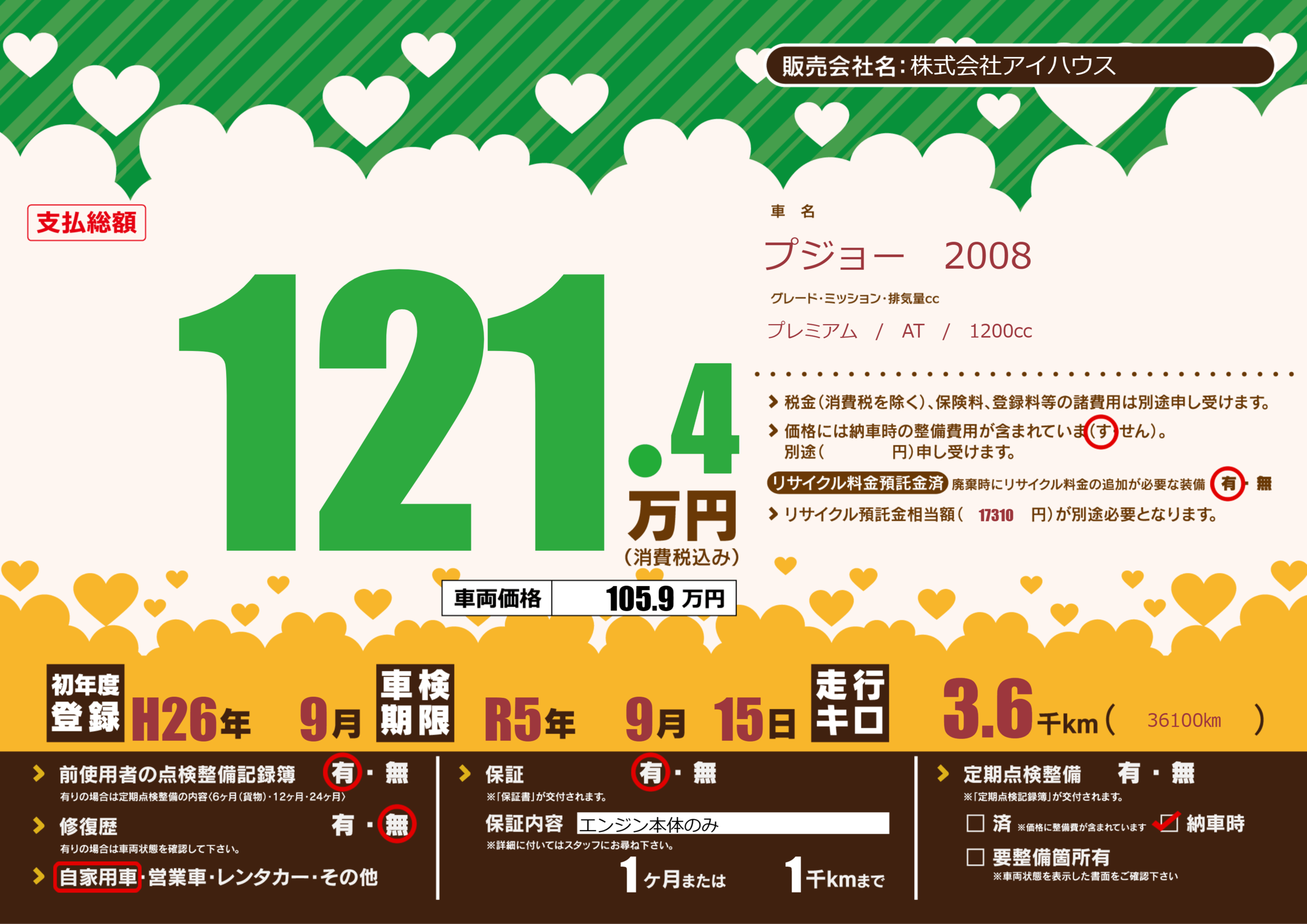 | 車名 | プジョー 2008 | グレード ミッション 排気量 |