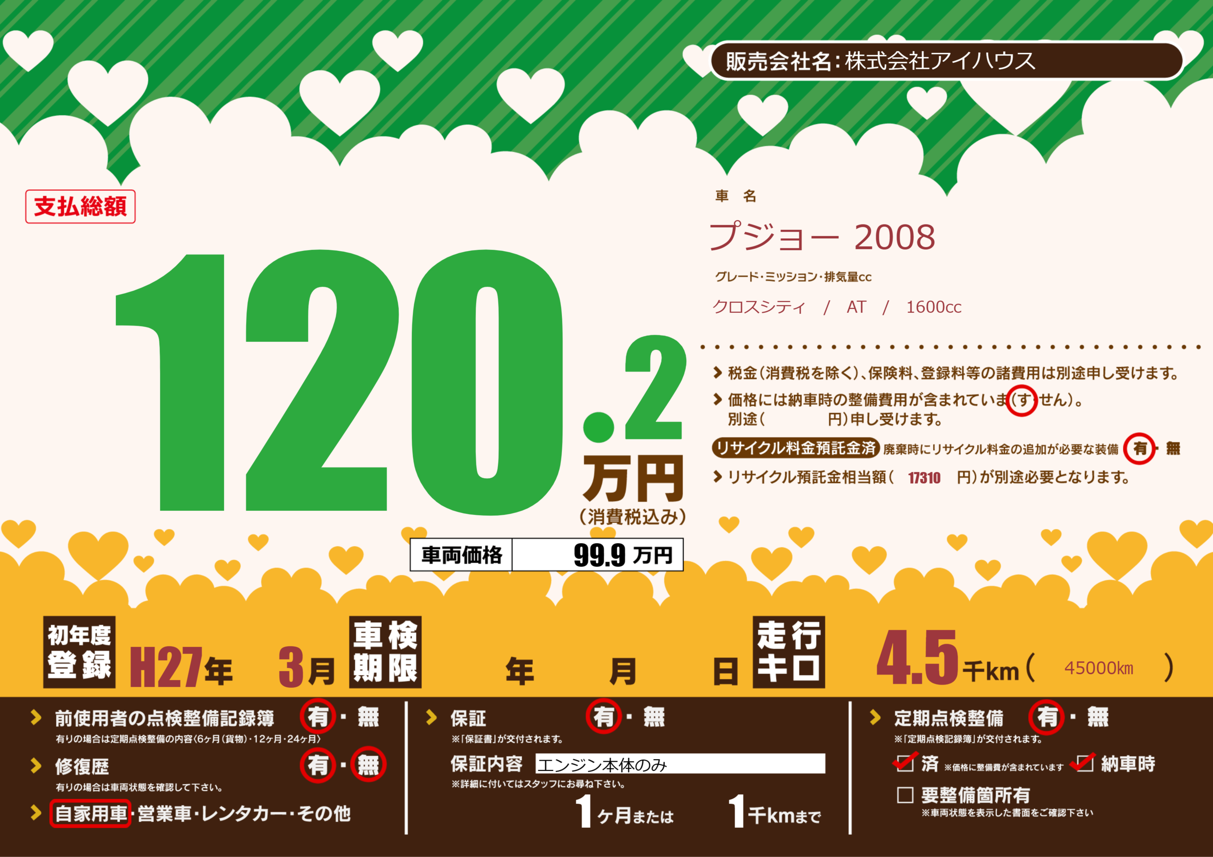| 定期点検整備 | 定期点検整備あり 定期点検整備済み 納車時あり | ||