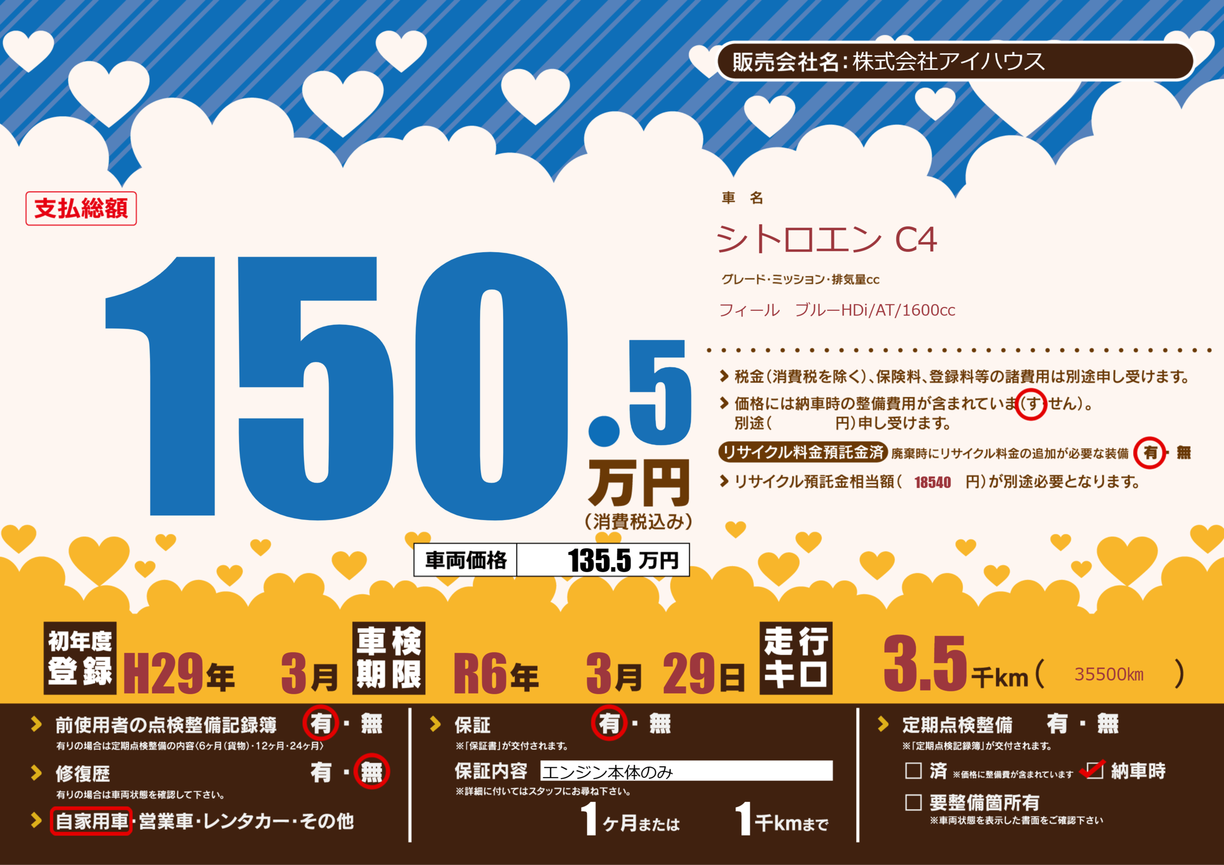 | 車名 | シトロエン C4 | グレード ミッション 排気量 |