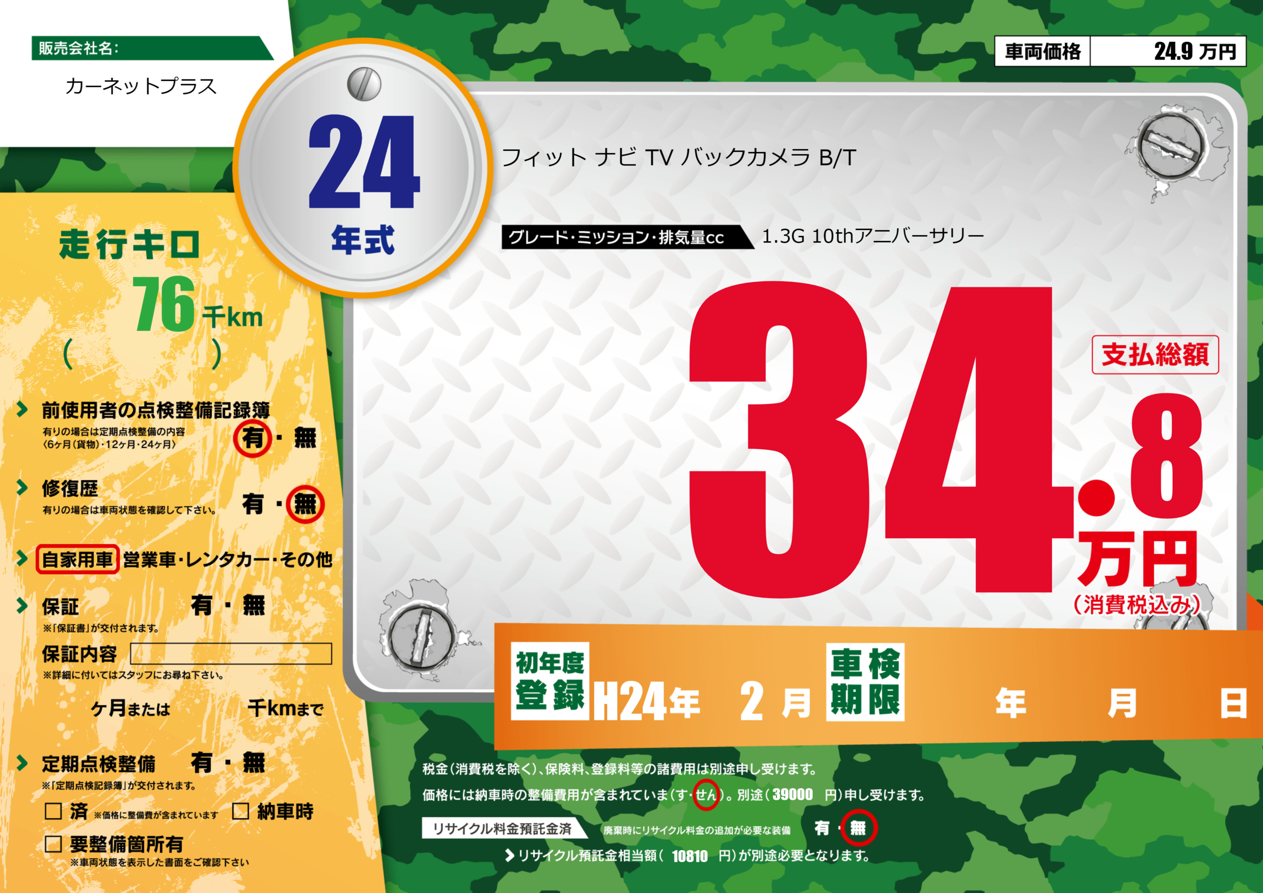 | 車名 | フィット ナビ TV バックカメラ B/T | グレード ミッション 排気量 |