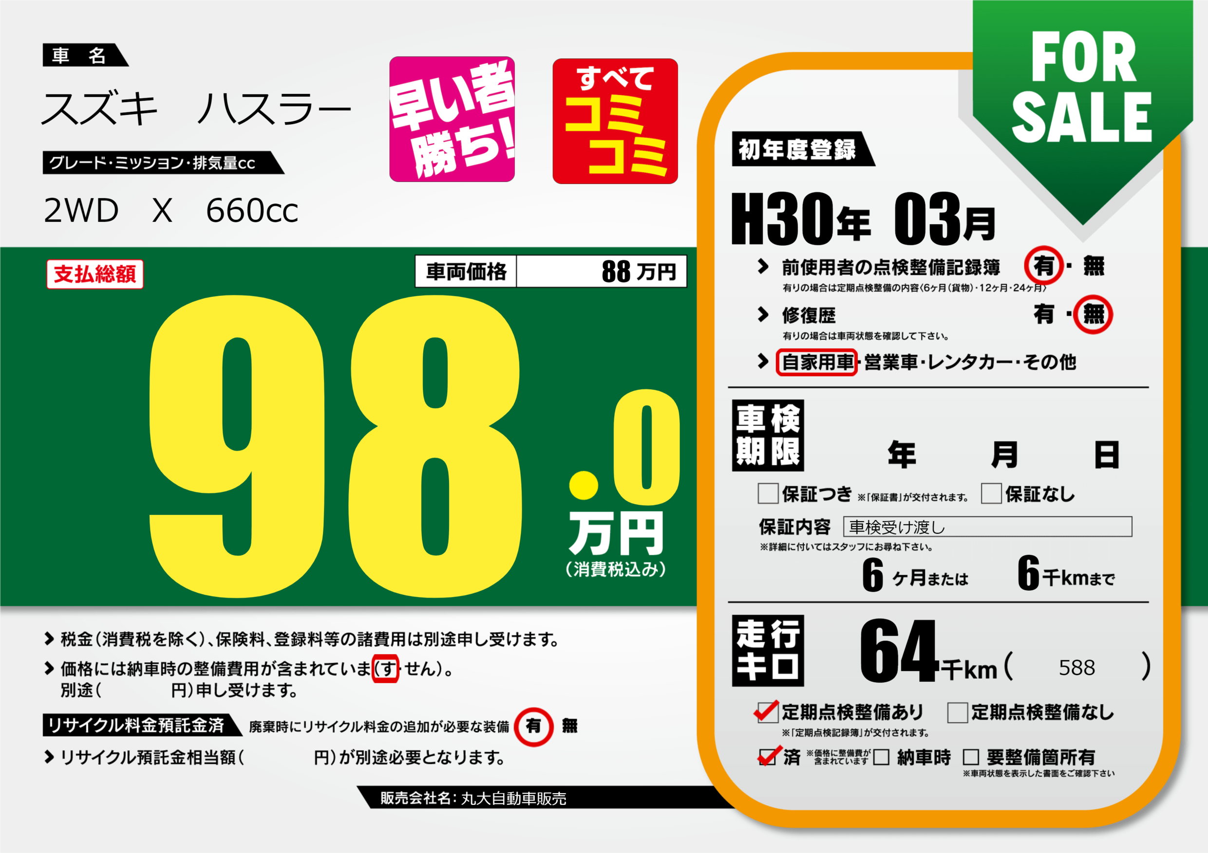 | 車名 | スズキ ハスラー | グレード ミッション 排気量 |