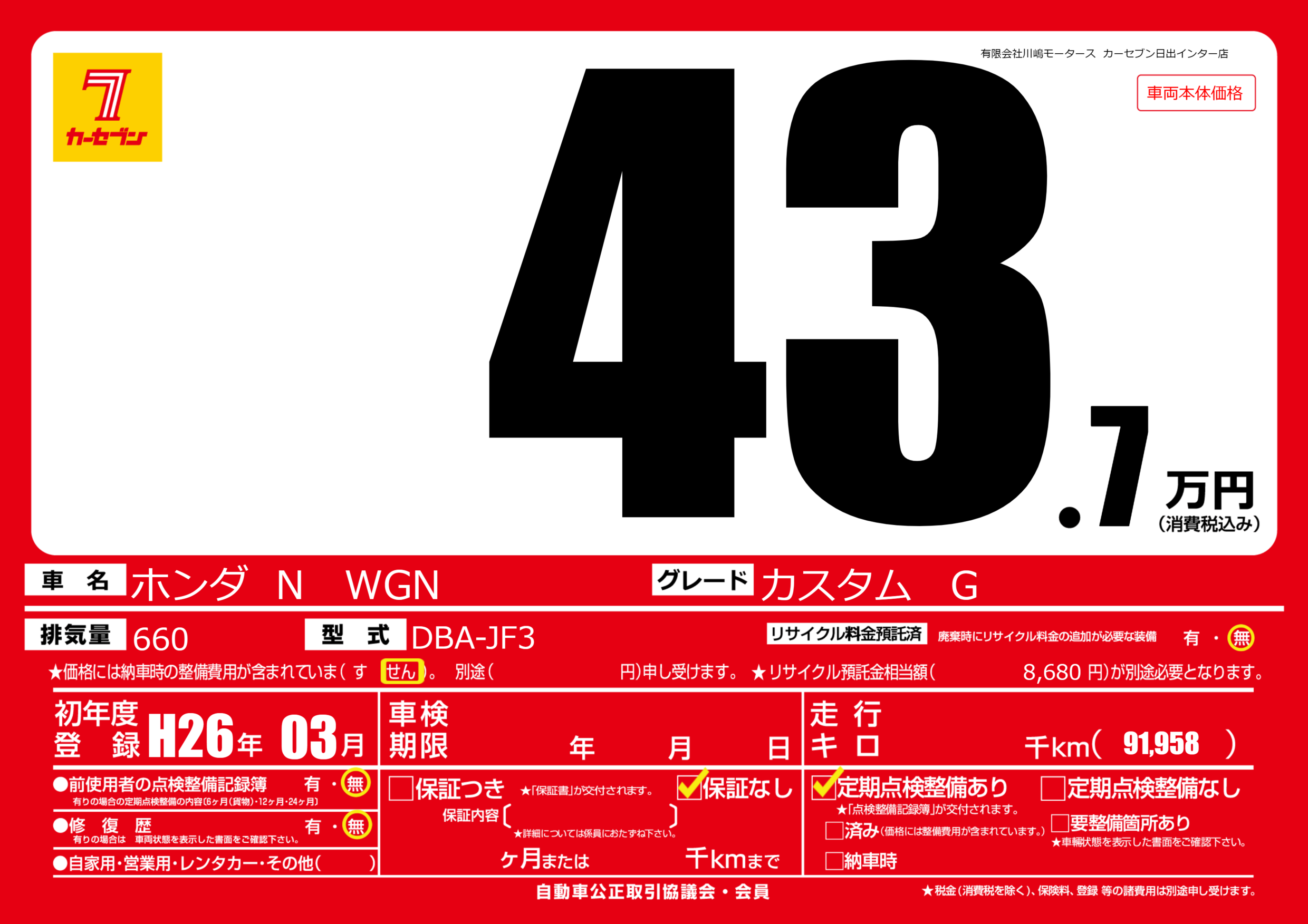 | 車名 | ホンダ N WGN | グレード ミッション 排気量 |