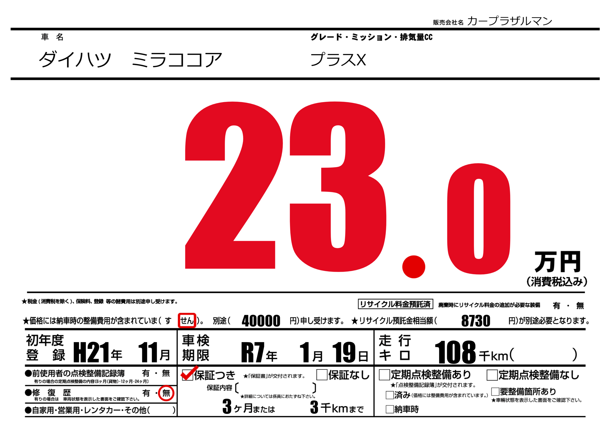 保証付き 保証内容(---) 3ヶ月または(3)千kmまで |
