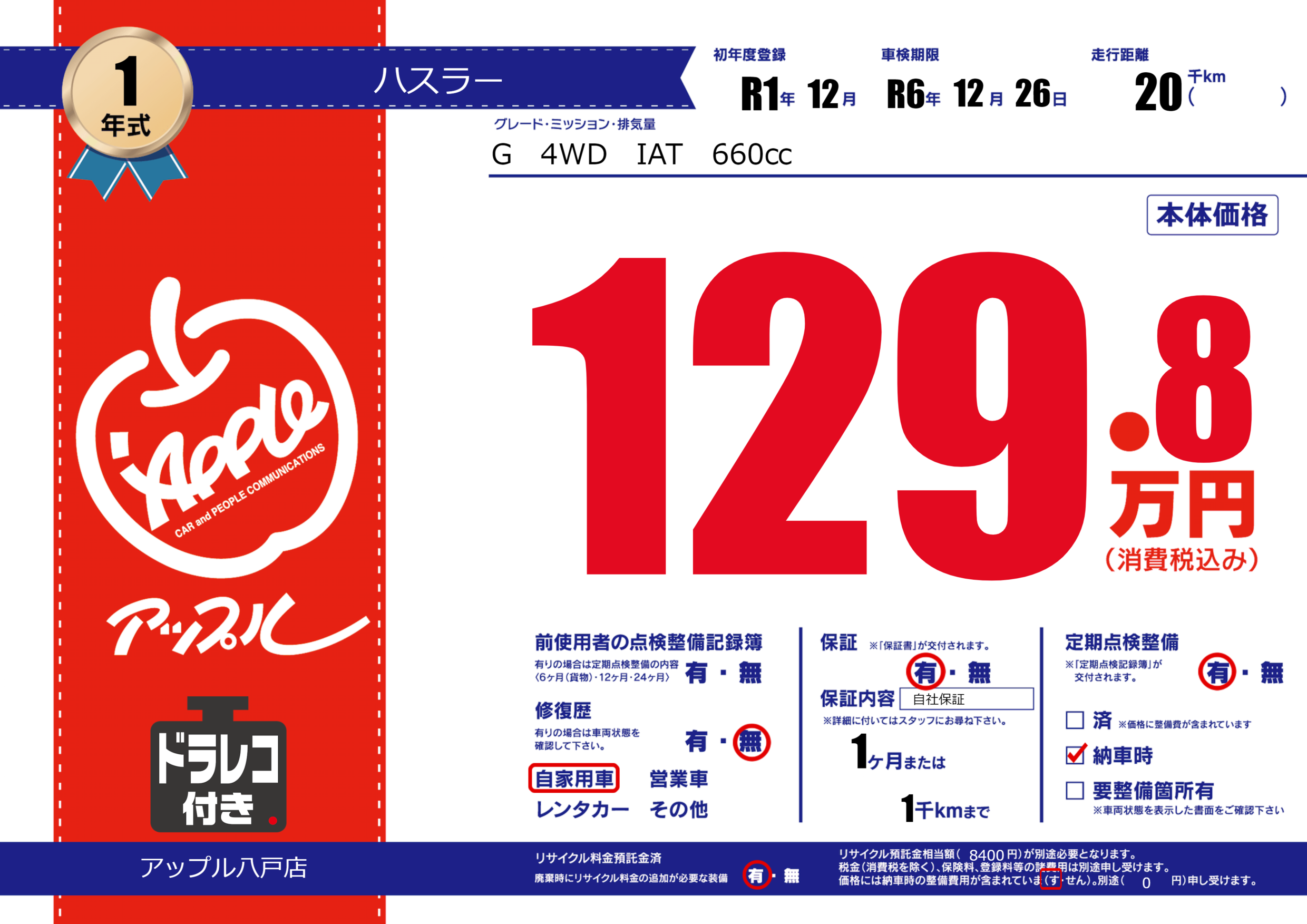 保証付き 保証内容( 自社保証) 1ヶ月または(1)千kmまで |