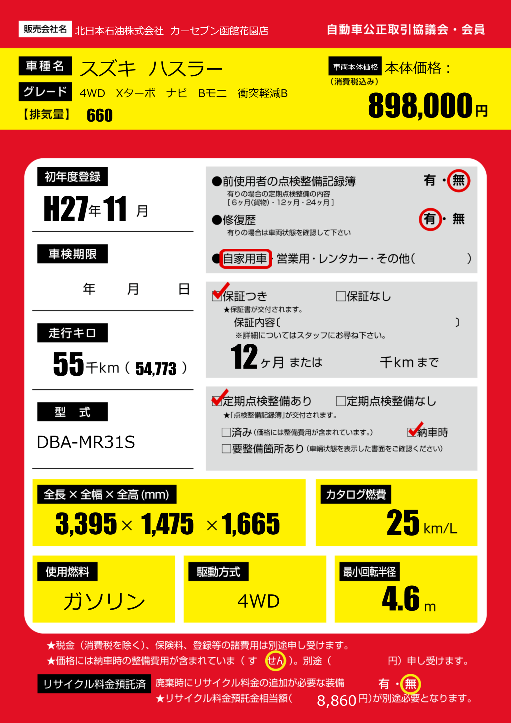 | 車名 | スズキ ハスラー | グレード ミッション 排気量 |